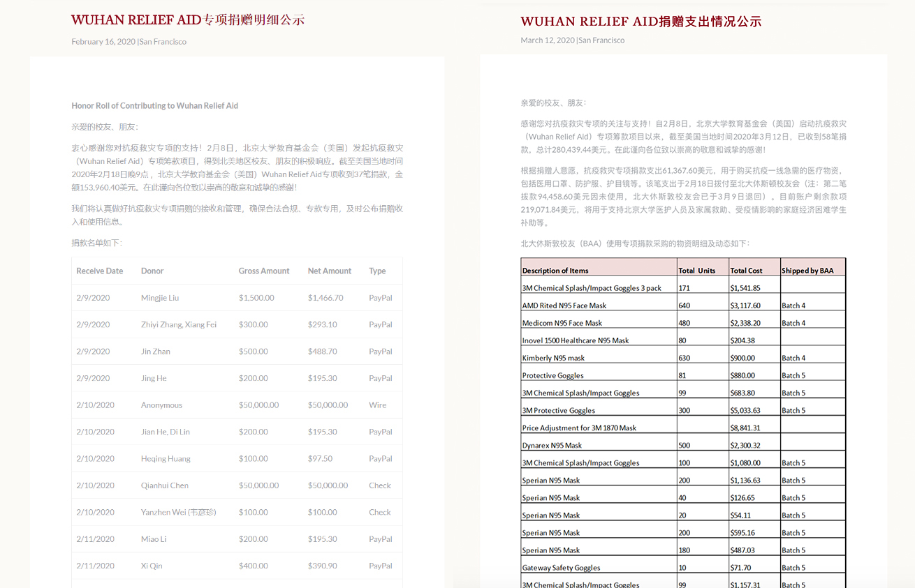 截至目前,此次专项已筹集善款59笔,共计330,439.44美元,其中61,367.6美元已用于购买一线最急需的医疗物资,包括医用口罩、防护服、护目镜等;88,043.34美元将用于补助奋斗在一线的北大援鄂医疗团队;181,028.50美元将用于为受疫情影响的北大家庭经济困难学生提供紧急救助。