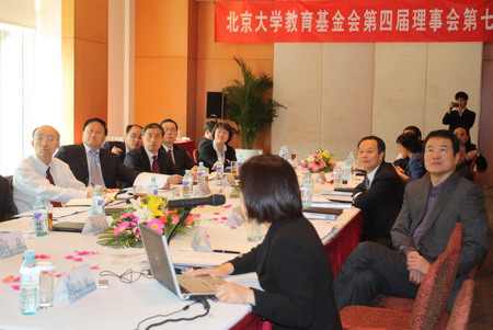 会议现场 2011年9月23日上午,北京大学教育基金会第四届理事会第七次会议在北京大学博雅国际会议中心召开。北京大学党委书记朱善璐,北京大学校长周其凤,北京大学教育基金会理事长闵维方,常务副校长吴志攀,常务副校长柯杨,副校长刘伟,校总会计师闫敏,教育基金会副理事长廖陶琴,校长助理、教育基金会秘书长邓娅,研究生院常务副院长王仰麟,医学部副主任李鹰,政府管理学院常务副院长傅军,著名投资家林君明,中坤集团董事长黄怒波,方正控股董事局主席张旋龙,方正集团高级副总裁、党委副书记汤世生,北京大学名誉校董、教育基金会监事陈国钜,教育基金会名誉理事陈伍玉华等出席会议。基金会法律顾问、天元律师事务所律师刘艳等列席会议。会议由闵维方理事长主持。