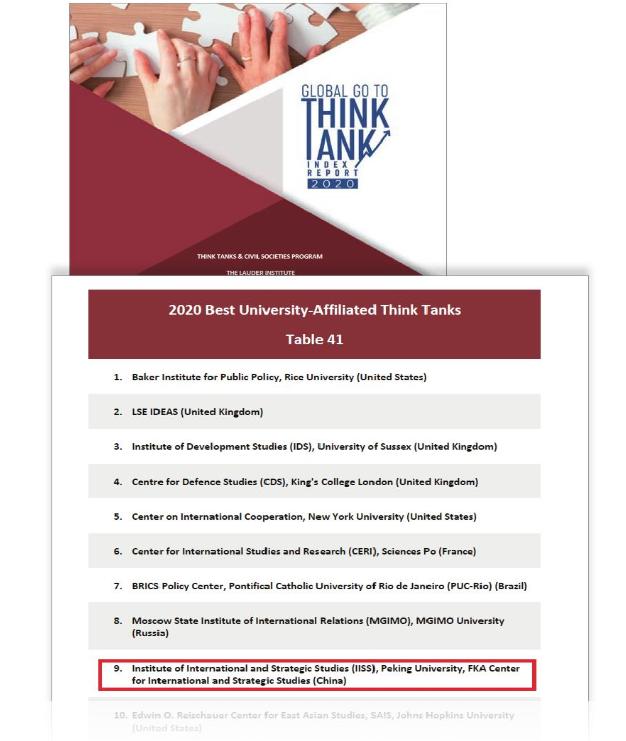 2021年,在《全球智库报告2020》中,研究院位居全球高校智库第9位(亚洲高校第1位),全球智库总排名第81位,中印日韩四国智库第25位