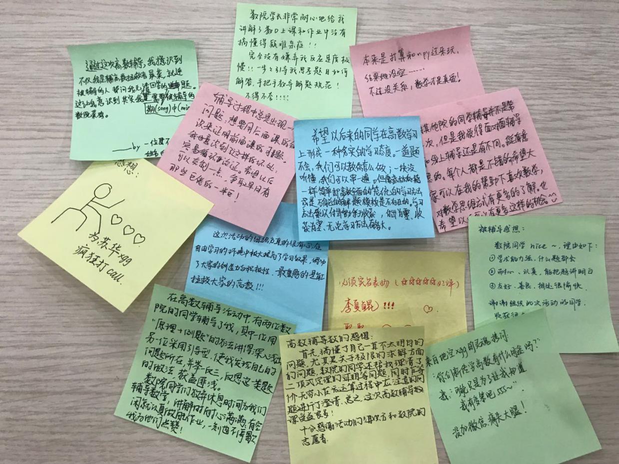 每次辅导结束后,都有不少被辅导的同学留下便利贴,表达自己的感恩,赞叹志愿者的耐心友善,有的还会特意点名表扬。你来我往之间,产生过不少“佳话”,有更进一步的友谊,也有不期而至的爱恋。