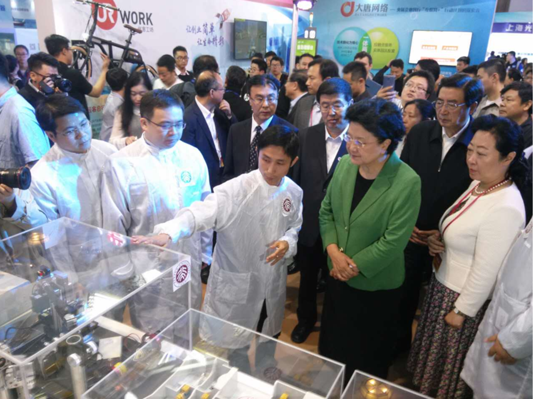 2016年5月,北京大学核物理与核技术国家重点实验室(重离子物理研究所)的“激光粒子加速器与技术革命”项目参与了全国科技周展示,图为颜学庆教授为刘延东等领导同志汇报科研进展