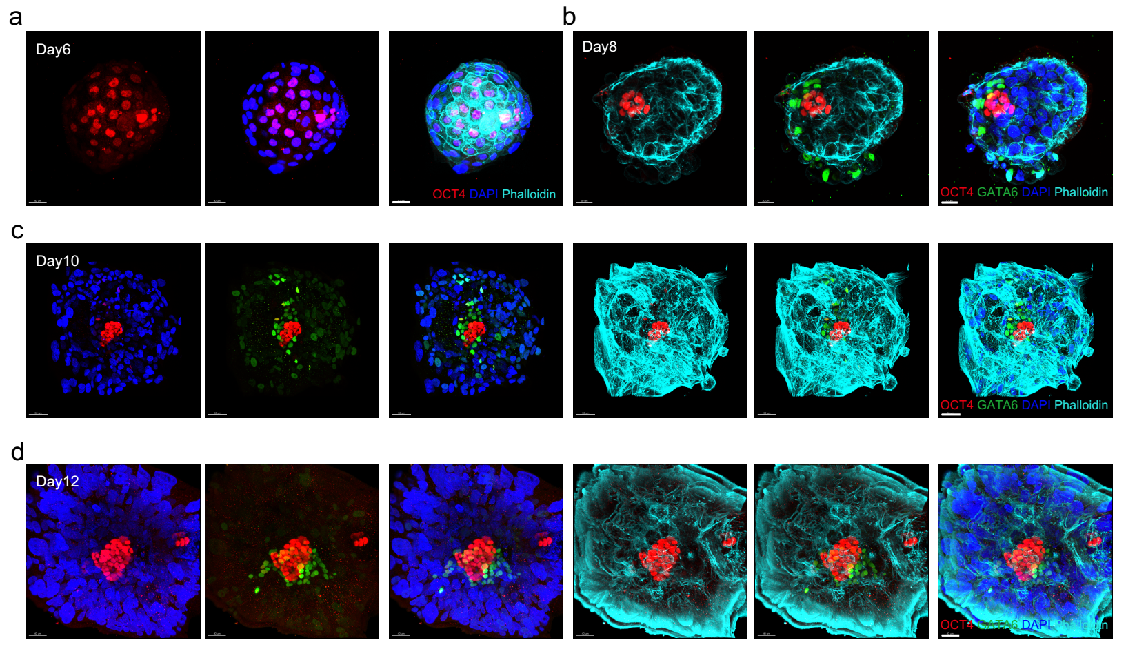 为了证实胚胎在体外无母体组织参与情况下的着床过程,研究者根据已报道胚胎培养策略重现了胚胎形态学动态变化特征1,11。证据显示胚胎在无母体组织参与下能发育至第12/14天,胚胎逐渐呈现出特异性的形态学特征,例如滋养外胚层细胞数量大幅度增加,上胚层逐渐形成羊膜腔以及原始内胚层逐渐生长并逐渐包围上胚层(图1&视频)。根据国际伦理学准则,研究者在第14天终止了体外胚胎培养实验。