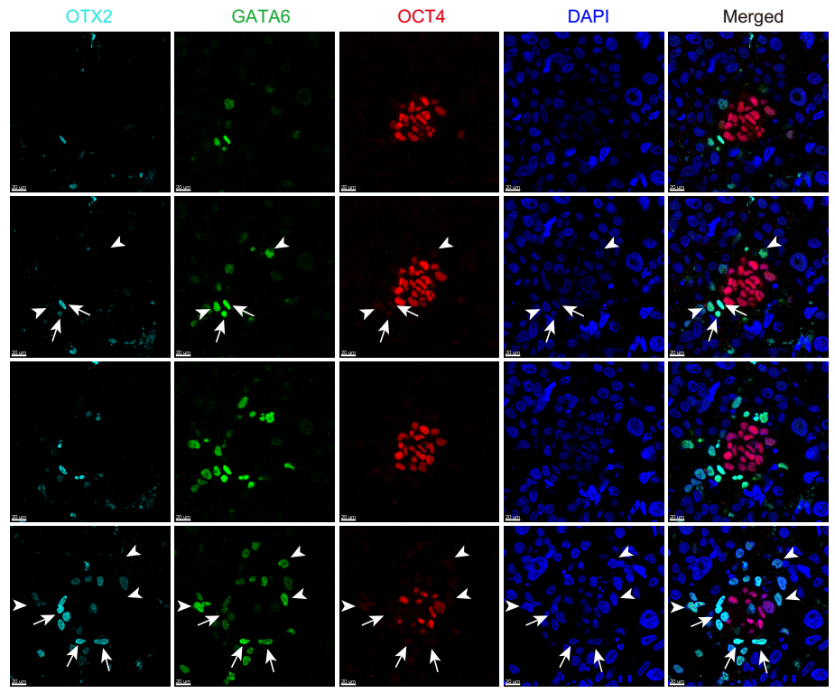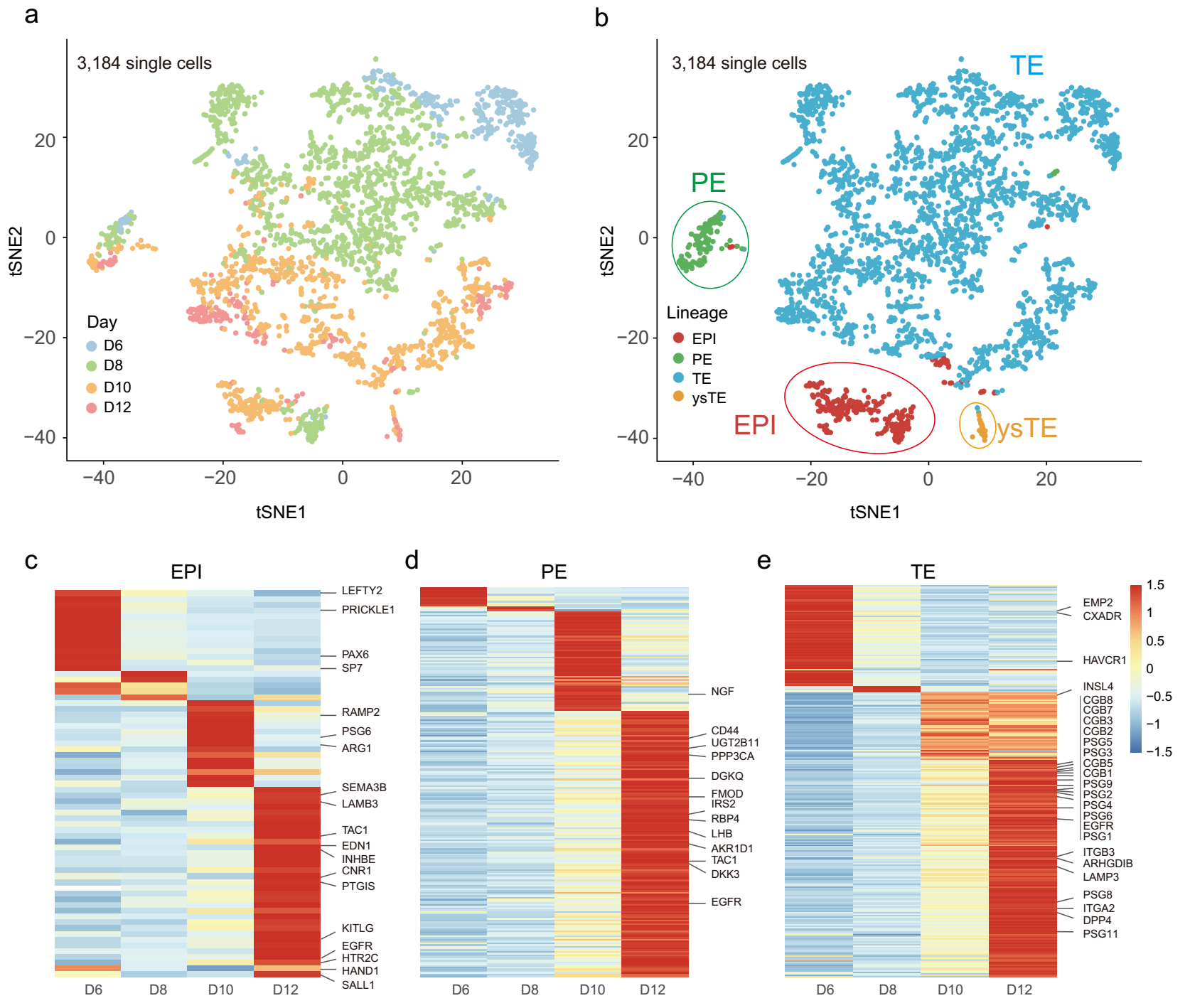 OTX2曾被报道是围着床时期胚胎上胚层(EPI)多能性转化(pluripotency transition)的重要标志基因19,然而本研究的转录组数据显示,OTX2主要表达在原始内胚层(PE),并非在上胚层(EPI)。进一步的全胚胎免疫荧光染色显示,OTX2表达在部分原始内胚层细胞中,与转录组分析结果一致。这一结果表明,具有相同发育来源(内细胞团起源)的两类细胞(上胚层细胞和原始内胚层细胞)可能携带特殊基因表达痕迹(图4)。这些数据提示该研究中转录组数据的潜在资源价值,新的谱系标记基因鉴定可能有助于早期胚胎中的谱系鉴定和干/祖细胞衍生研究。
