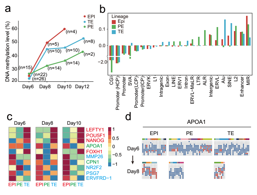 有趣的是,不同谱系间差异DNA甲基化基因分析表明,各个谱系在胚胎第十天都携带着特异性DNA甲基化。例如,多能性基因POU5F1和NANOG在第八天滋养外胚层细胞中被特异性甲基化,而上胚层和原始内胚层细胞则没有。相反,滋养外胚层发育基因如MMP26和PSG7在上胚层和原始内胚层细胞中特异性甲基化,但在第八天滋养外胚层细胞中却维持着低甲基化的状态21,22。相比之下,第八天原始内胚层标记基因如APOA1和CPN1在上胚层和滋养外胚层细胞中特异性甲基化,而在原始内胚层细胞中没有被甲基化(图7)23,24。这些结果表明,DNA甲基化在着床后早期的时间窗口内可能参与特异性调控了关键基因的转录,与基因转录共同协调决定了不同细胞谱系的发育潜能特化过程。