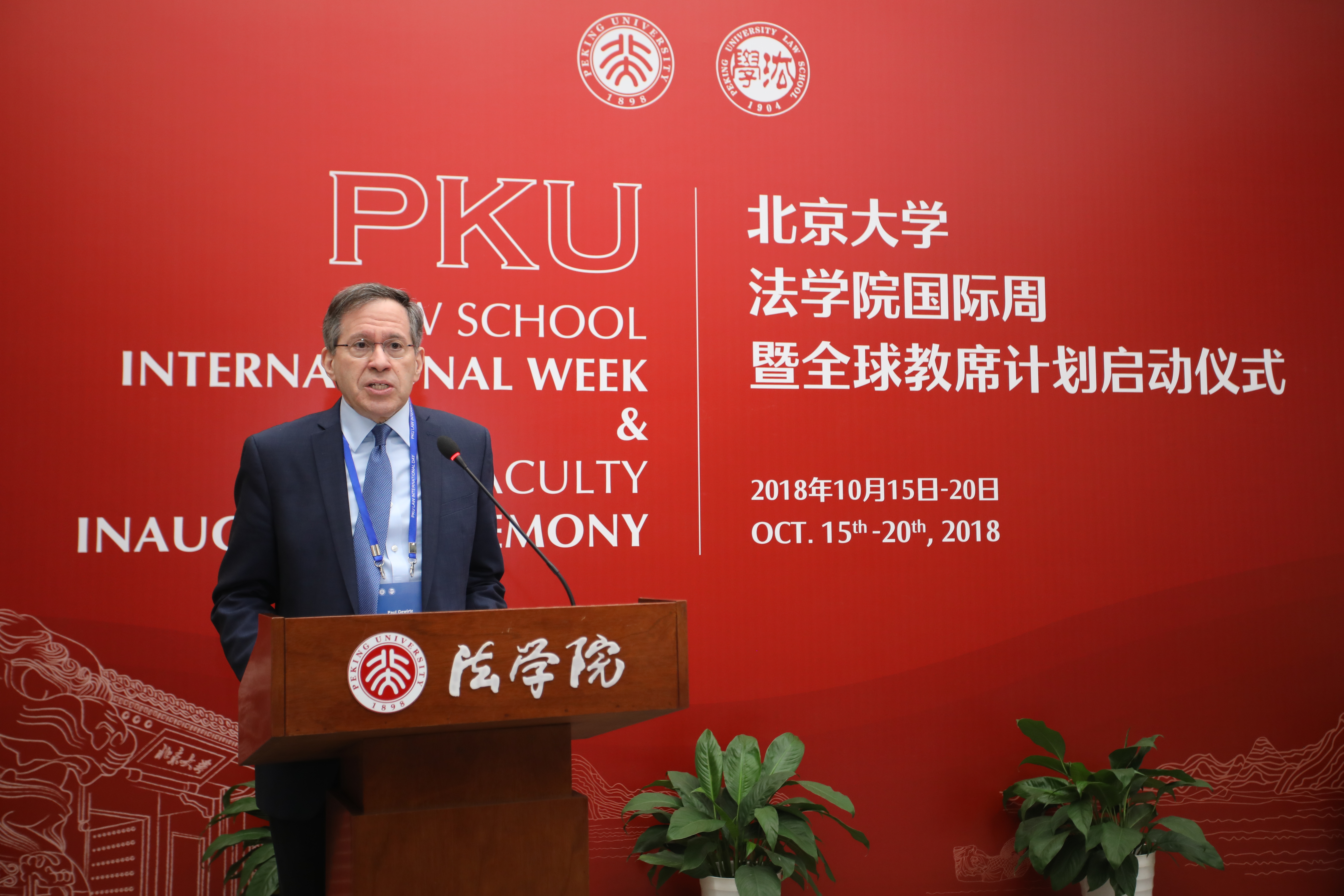 北京大学法学院全球教席主席、耶鲁大学法学院教授、中国法律研究中心主任教授Paul Gewirtz致辞,他代表全体全球教席学者感谢北京大学法学院对每一位全球教席学者的厚爱与信任。他表示,法律在全球视域中是相互联系的,理解法律的复杂性和相互依存性并将它和各国的法律实践结合起来是十分有必要的;全球教席教授可以贡献他们对全球法律相互依存这一议题的观点和理解,拓宽法学教育者和受教育者的法律视野;从而让大家意识到,法律教育不仅培训律师执业,还培养更多领域的领导人,因为每一个重大问题都将在未来与法律相交。