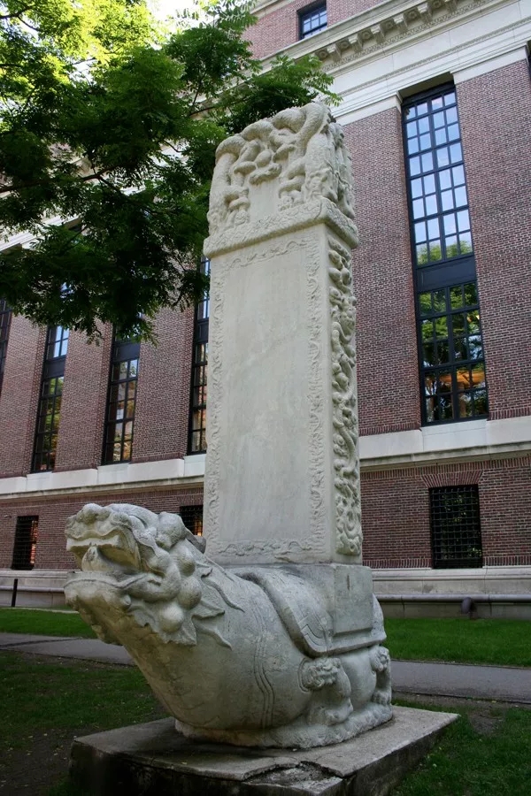 哈佛大学的韦德纳图书馆旁边有一个来自中国的精美石雕赑屃,一个背着石碑的石兽。它是1936年哈佛三百年校庆时,由时任北大文学院院长的胡适与其他哈佛的中国校友捐赠而来[4]。碑文写到:“我国为东方文化古国,近30年来,就学于哈佛,学成归国服务国家社会者,先后达几千人,可云极盛。”