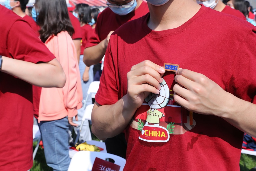 在老师们的见证下,新生全体起立,集体佩戴校徽。这枚校徽不只是北大人的身份标识,更是百余年来北大精神的凝结与延续。戴上校徽的那一刻,他们从此与这“永远的校园”真正血脉相连,“北京大学”四个字将成为他们一生的印记,也将见证新一代北大人在奋斗中融入时代洪流,携手共进,共同谱写青春的华彩篇章。