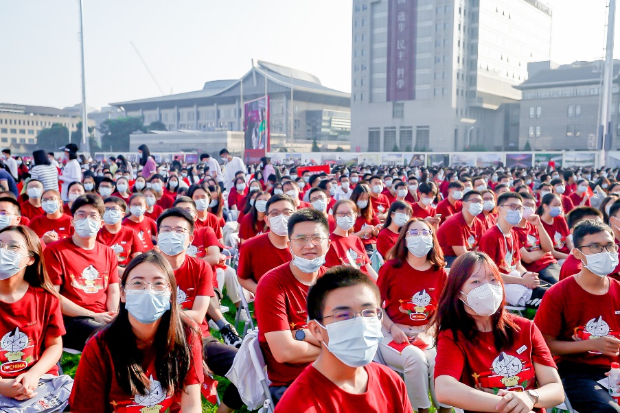 大屏幕播放的一段视频带领新生们回顾了北大与党同行、与国同心的历程,以及入学报到、疫苗接种、开学第一跑、新生训练营等场景,让现场氛围更加活跃。