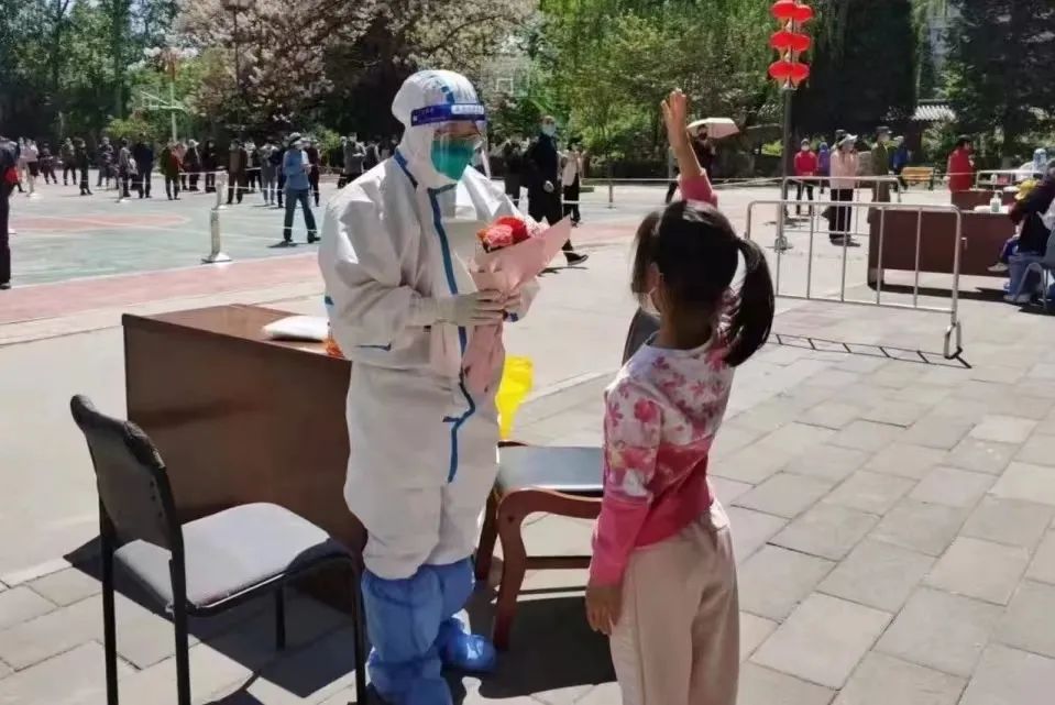 小朋友送来鲜花向“大白”致敬 (北医三院 图)
