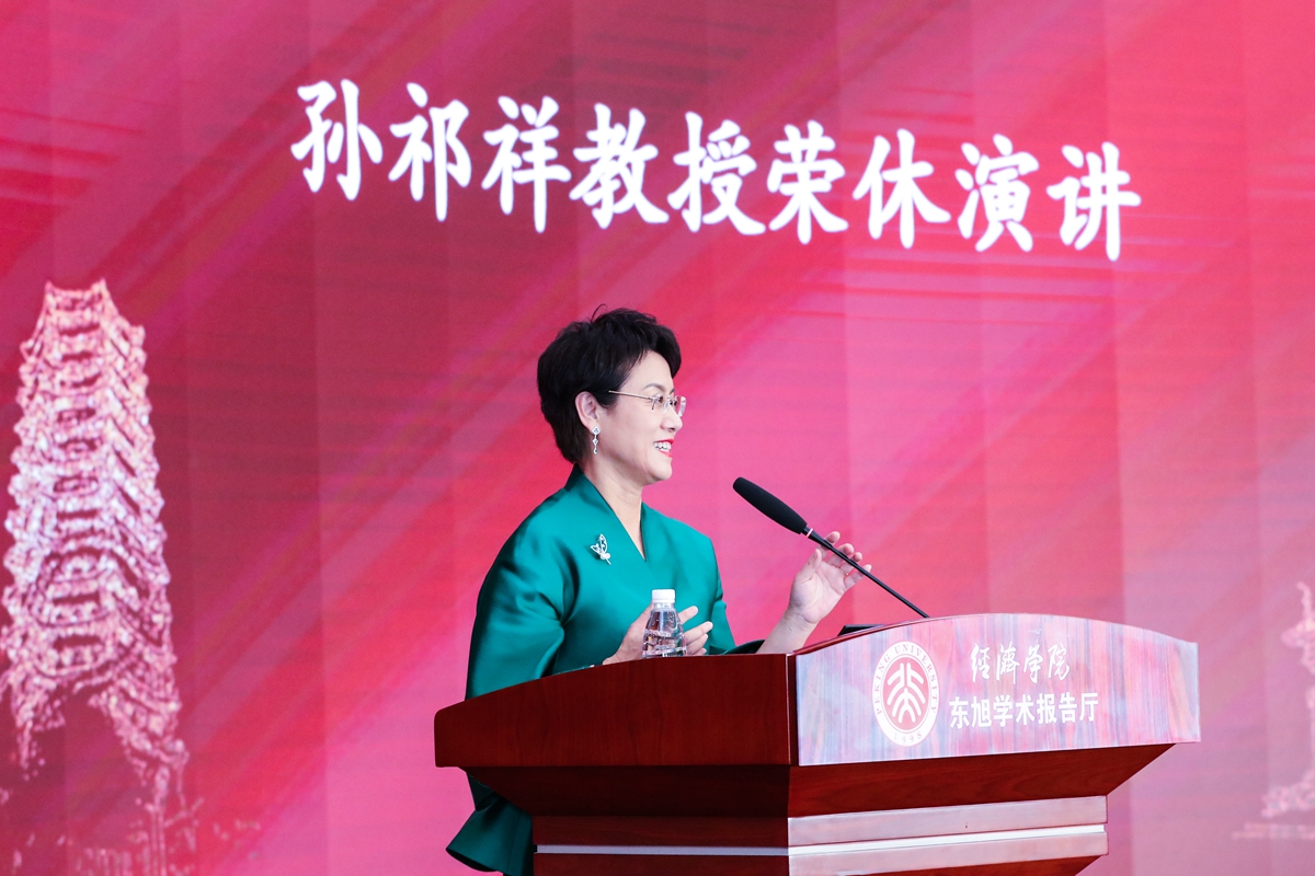 孙祁祥是北京大学风险管理与保险学系的首任系主任、经济学院百余年历史上的首位女院长。仪式上播放了风保系师生为她精心制作的视频短片《她的世界,丰盈而广阔》。从教三十余年以来,孙祁祥胸怀天下、甘为人梯,为北大保险学科的创立和发展作出了非凡的努力和卓越的贡献,荣获国际保险学会“约翰·毕克利创始人奖”、全国三八红旗手标兵、北京市先进工作者、北京市教学名师、北京市师德榜样等荣誉称号。课堂上,她妙语连珠、寓教于乐,用执着与坚守诠释教师的定义;课堂外,她潜心学术、身体力行,用自强与担当践行做人的道理。