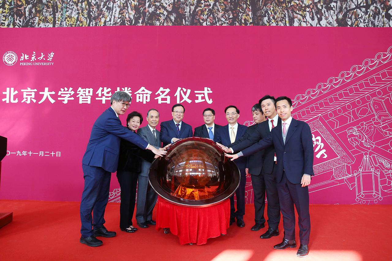 在热烈的掌声中,林高演校董、林福祥先生、陈国钜校董、陈伍玉华女士、陈上智校董、邱水平书记、郝平校长、王博副校长、史宇光教授共同启动水晶球,命名“智华楼”,开启了共育智慧华人的新篇章。