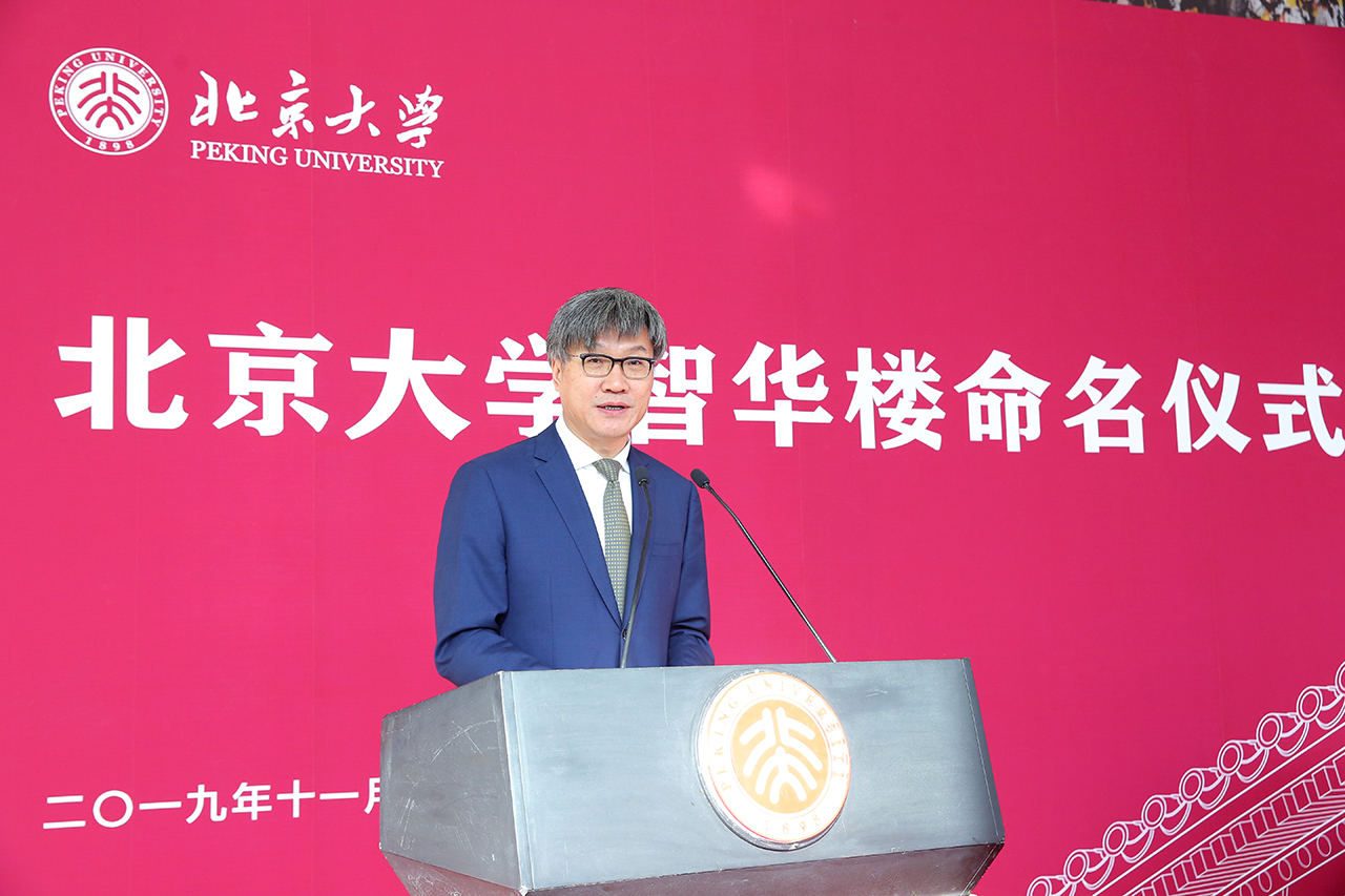 11月20日上午,由香港恒基集团副主席、智华基金会主席、北京大学名誉校董林高演捐资支持改造的北京大学“智华楼”命名仪式在百周年纪念讲堂举行。林高演先生及家人林福祥,北大之友(香港)创会会董、北京大学名誉校董陈国钜及夫人陈伍玉华,北大之友(香港)会董、北京大学名誉校董陈上智,北大之友(香港)创会会董伍嘉伟、会董崔劲中一行专程从香港来到北大,与北京大学党委书记、教育基金会理事长邱水平,校长郝平,数学科学学院副院长、长江特聘教授史宇光,数学科学学院党委副书记、副院长孙赵君,房产管理部部长殷雪松,基建工程部部长白利明,教育基金会秘书长李宇宁,党办校办副主任付帅,教育基金会副秘书长耿姝等师生代表共同出席。副校长、教育基金会副理事长王博主持仪式。
