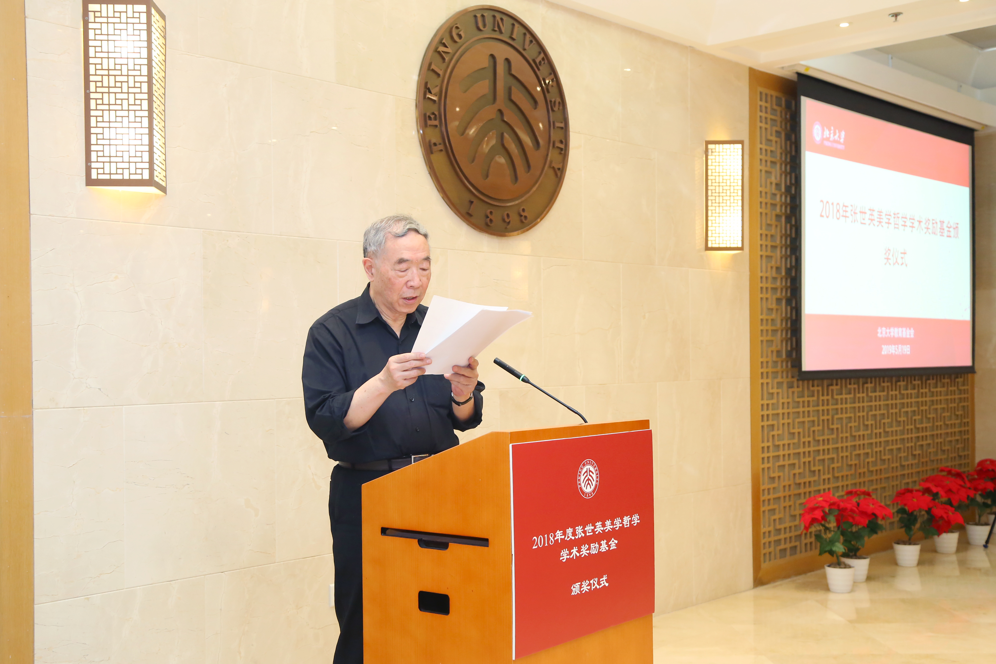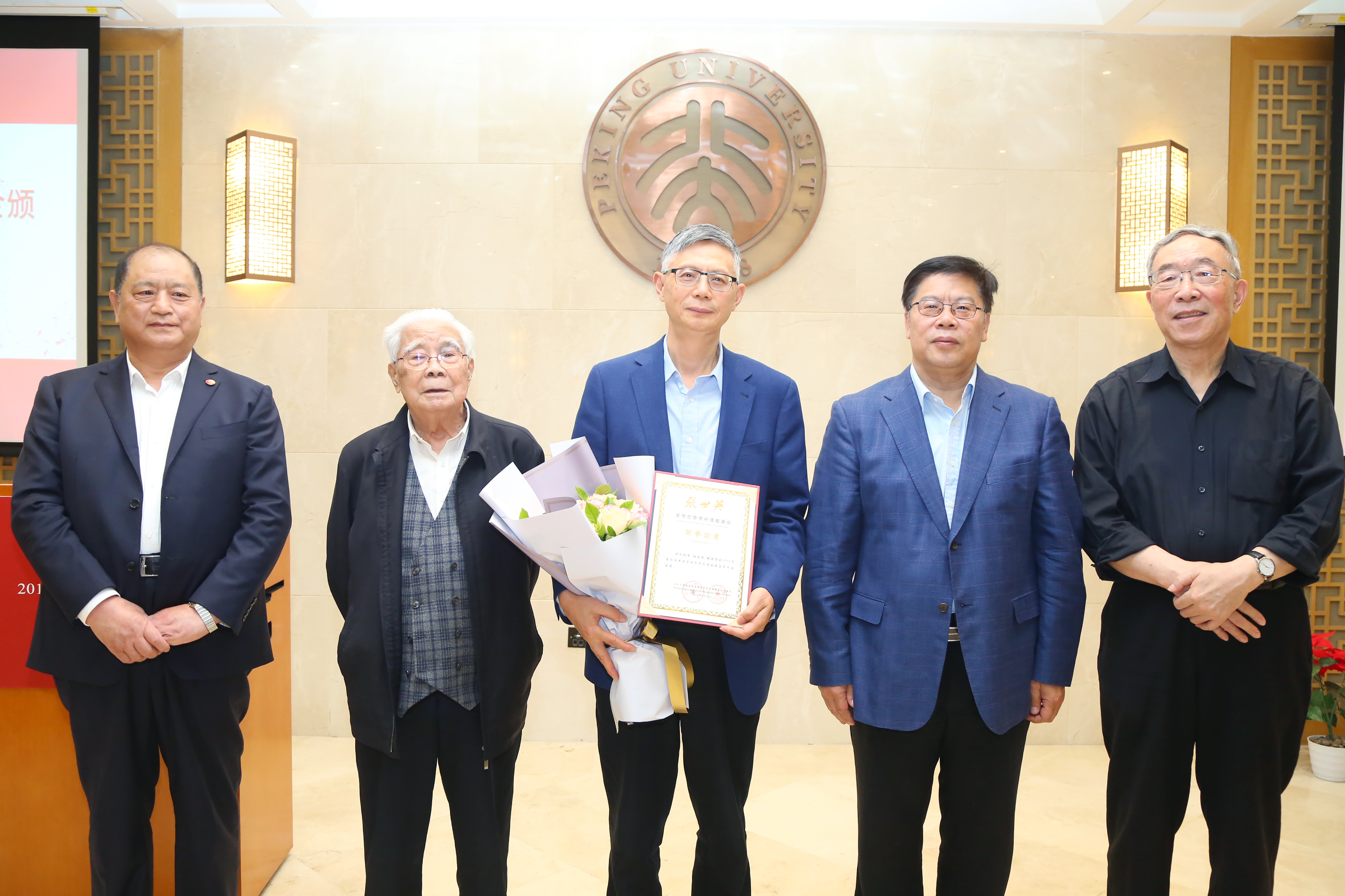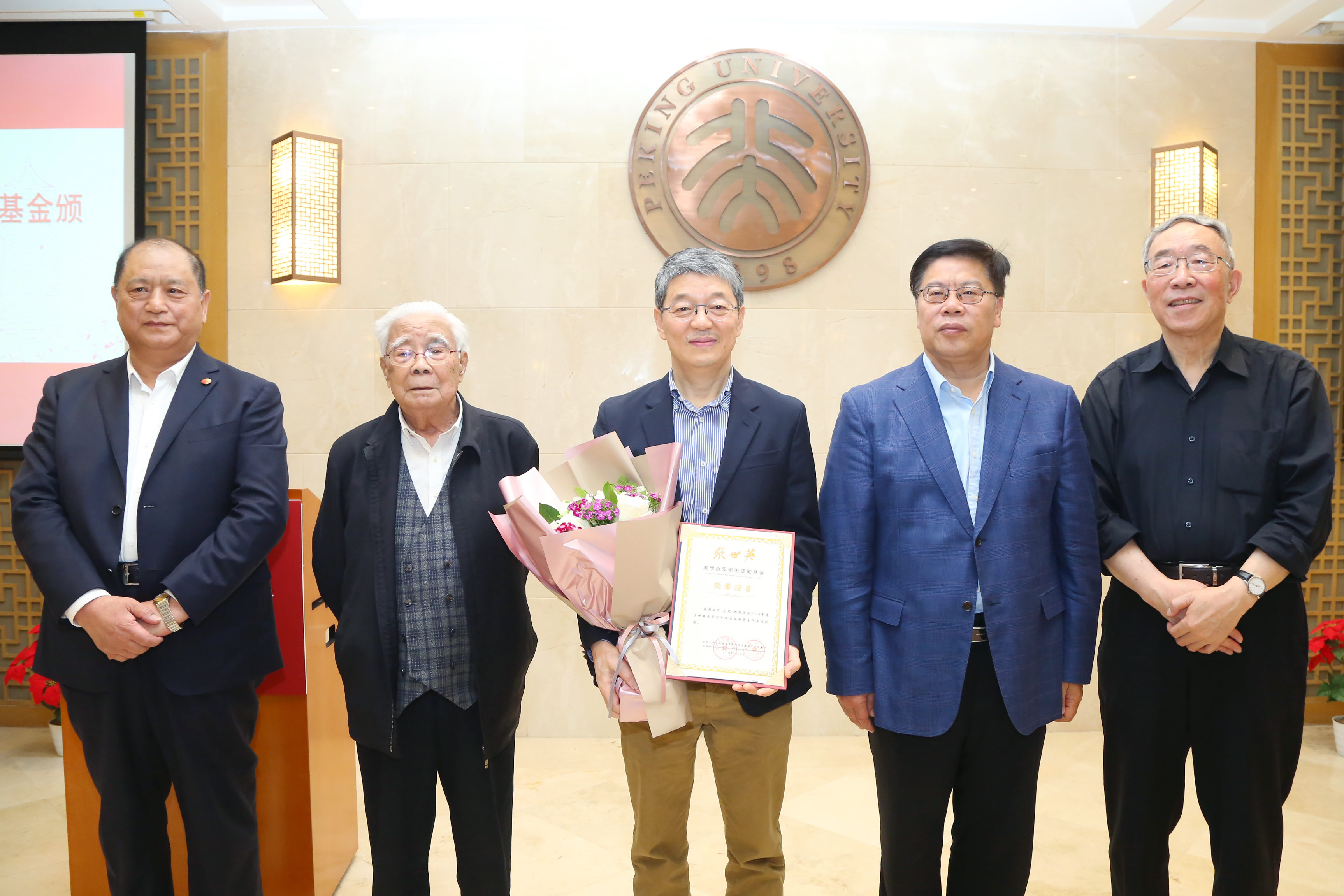 北大哲学系教授张世英先生,中国泛海公益基金会秘书长李建昌,北京大学党委书记、教育基金会理事长邱水平,副校长、教育基金会副理事长王博,哲学社会科学资深教授叶朗,美学与美育研究中心主任朱良志,教育基金会秘书长李宇宁和师生代表等共同出席颁奖仪式。北京大学哲学系主任仰海峰主持仪式。