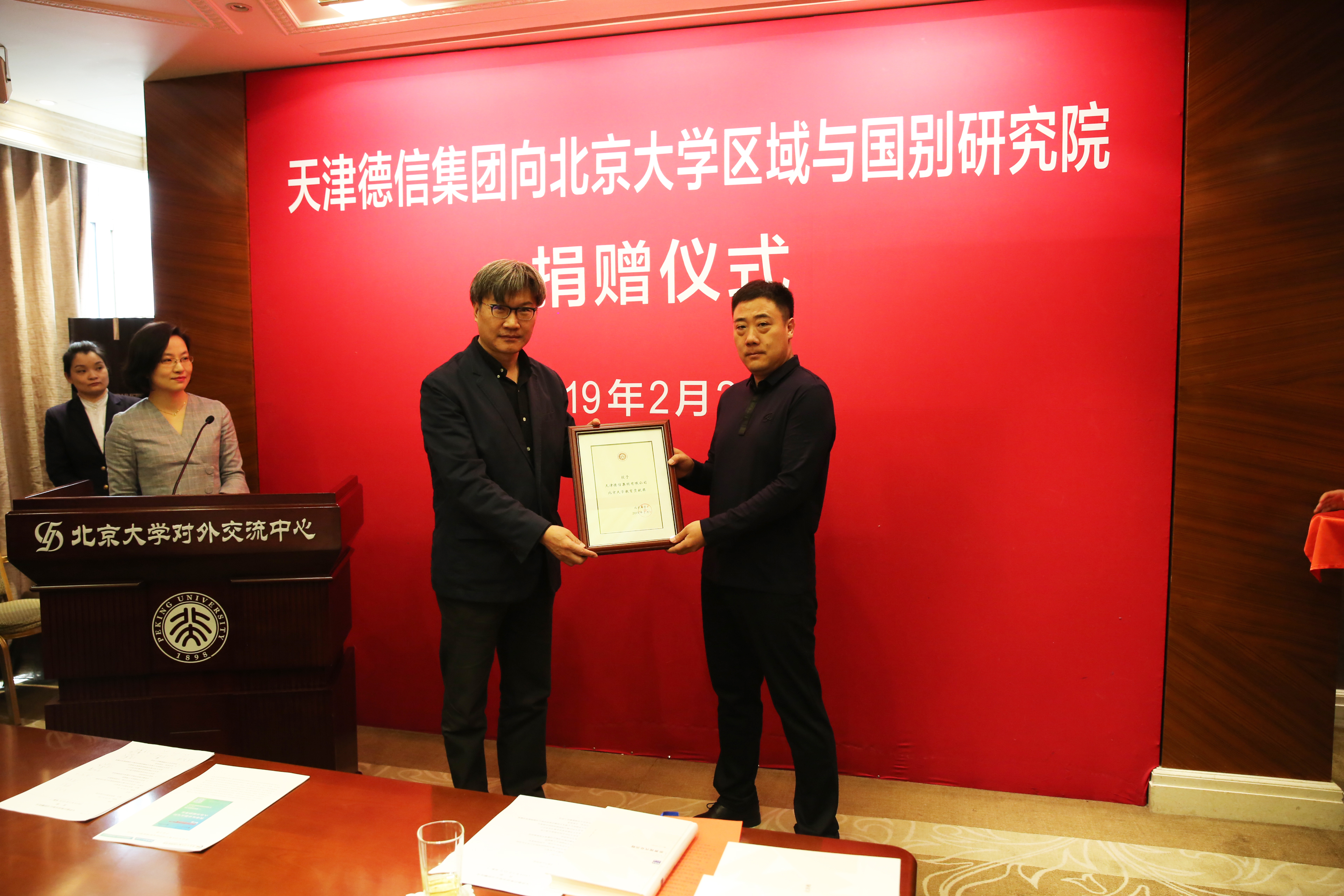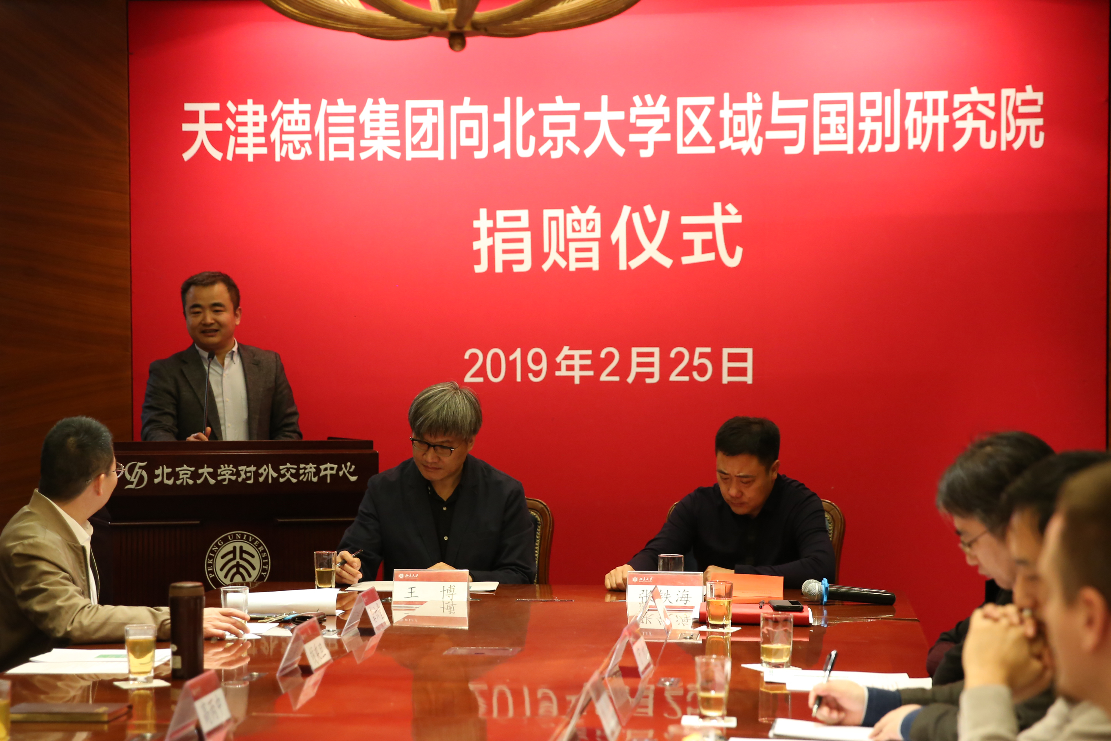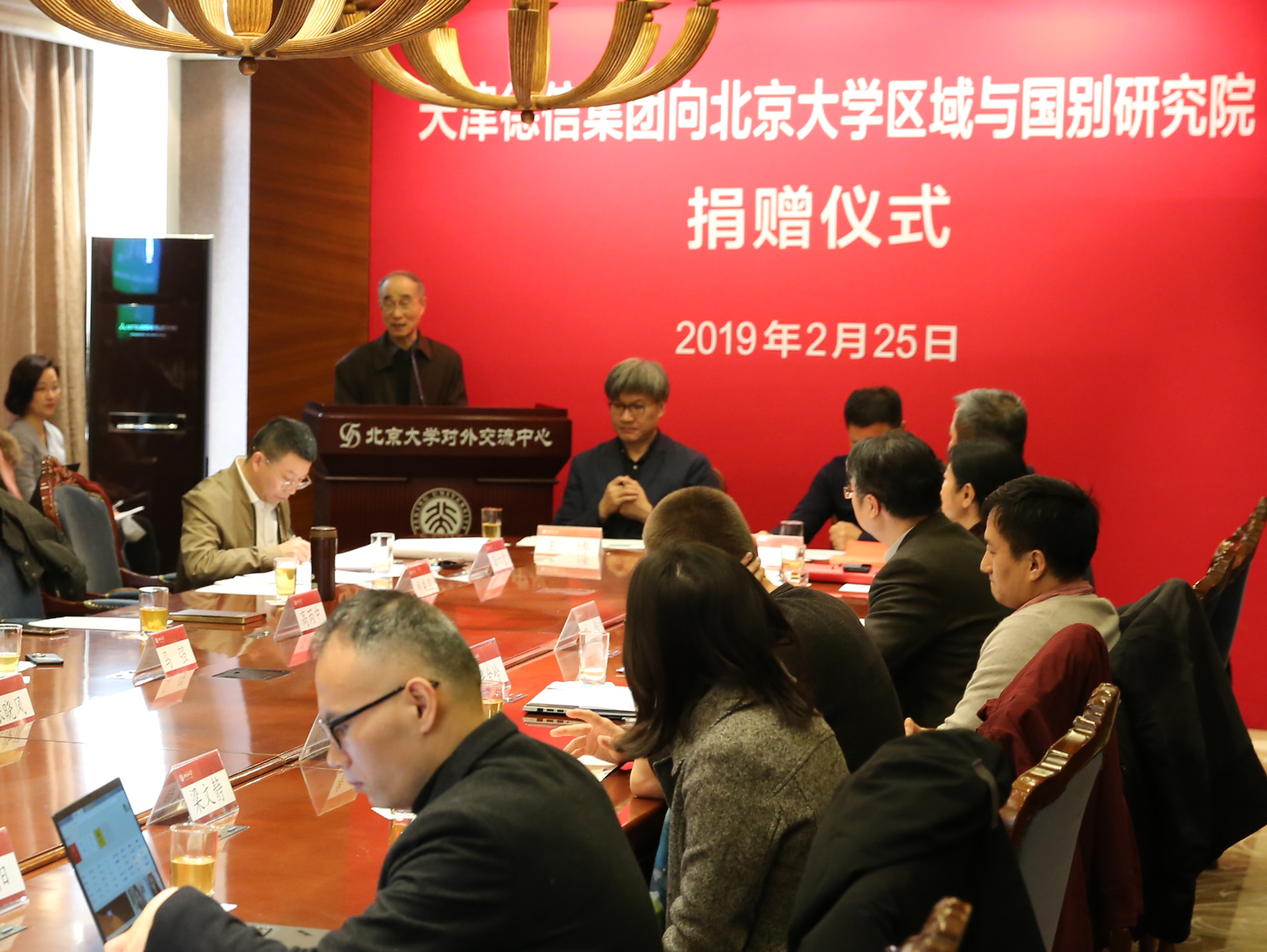 2月25日,天津德信集团有限公司向北京大学区域与国别研究院捐赠仪式在英杰交流中心星光厅举行。天津德信集团董事长张铁海,北京大学副校长、教育基金会副理事长王博,区域与国别研究院院长钱乘旦、常务副院长宁琦,社会科学部部长龚六堂,教育基金会秘书长李宇宁等共同出席。