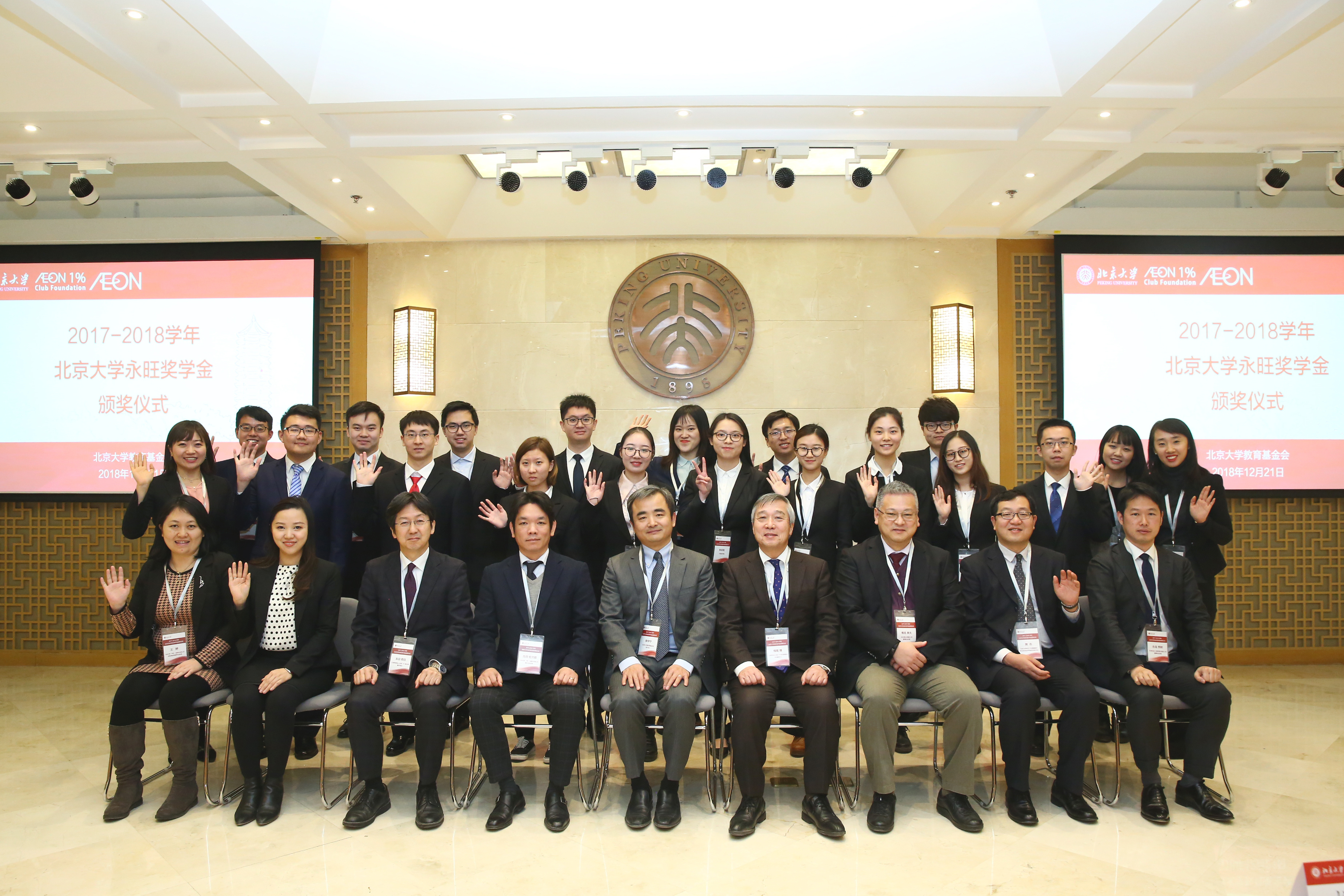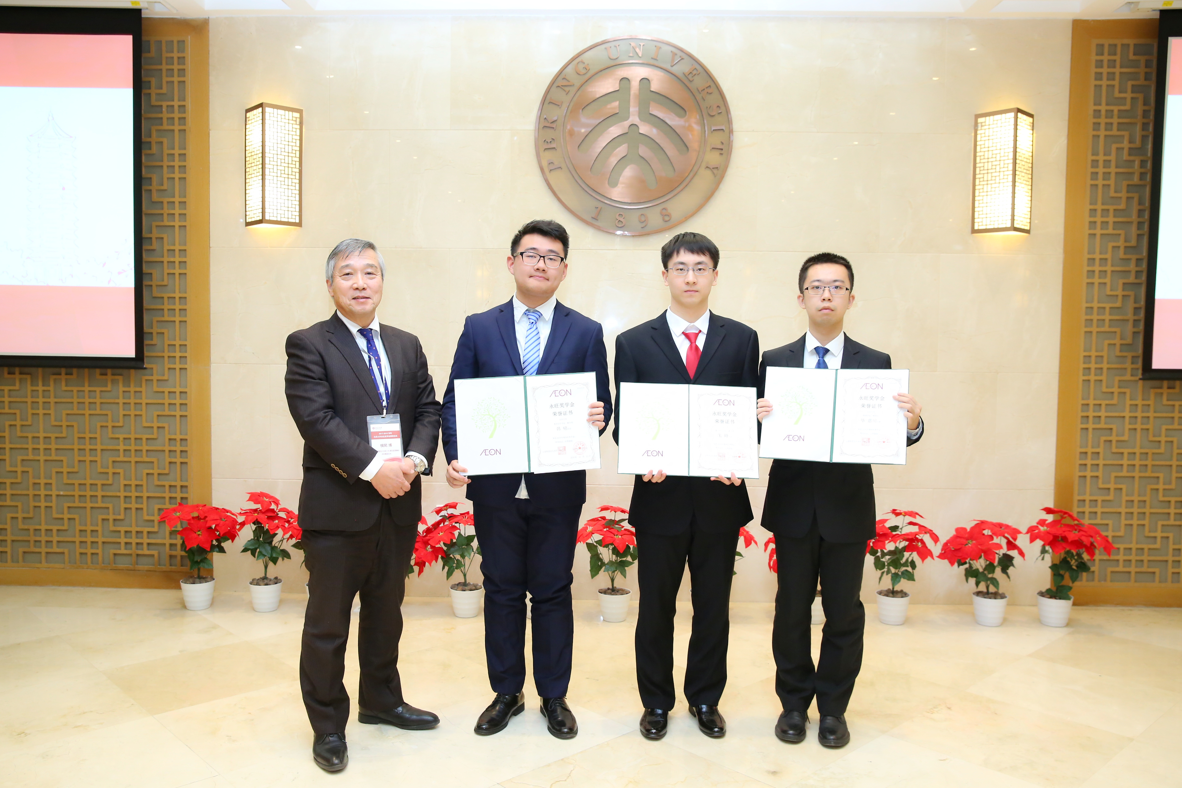 12月21日,2017-2018学年度北京大学永旺奖学金颁奖仪式在教育基金会北大之友报告厅举行。公益财团法人永旺1%俱乐部理事长兼永旺集团议长横尾博、永旺商业有限公司董事总经理椎名孝夫、天津永旺小额贷款有限公司董事总经理永岛秀树、永旺幻想(中国)儿童游乐有限公司董事长兼总经理池田宏次郎、公益财团法人永旺1%俱乐部事务局长本田阳生等莅临燕园,与北京大学教育基金会秘书长李宇宁,学生工作部副部长、学生奖励奖学金评审委员会秘书长樊志和获奖学生共同出席活动。颁奖仪式由教育基金会项目部部长禹洁主持。