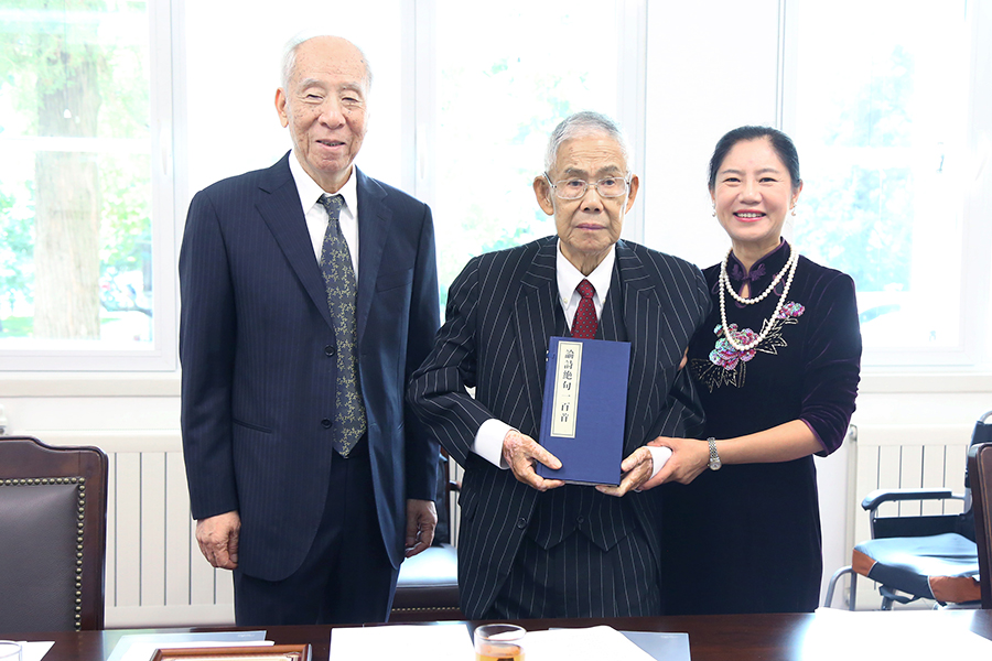 座谈会后,袁教授向冯先生赠送了自己的著作——《论诗绝句一百首》,全体人员在大雅堂前合影留念。
