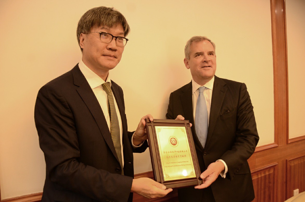 王博副校长与孙祁祥教授分别向Bruce Carnegie-Brown主席颁发了“英国劳合社----北京大学教育贡献奖”奖牌与捐赠证书。
