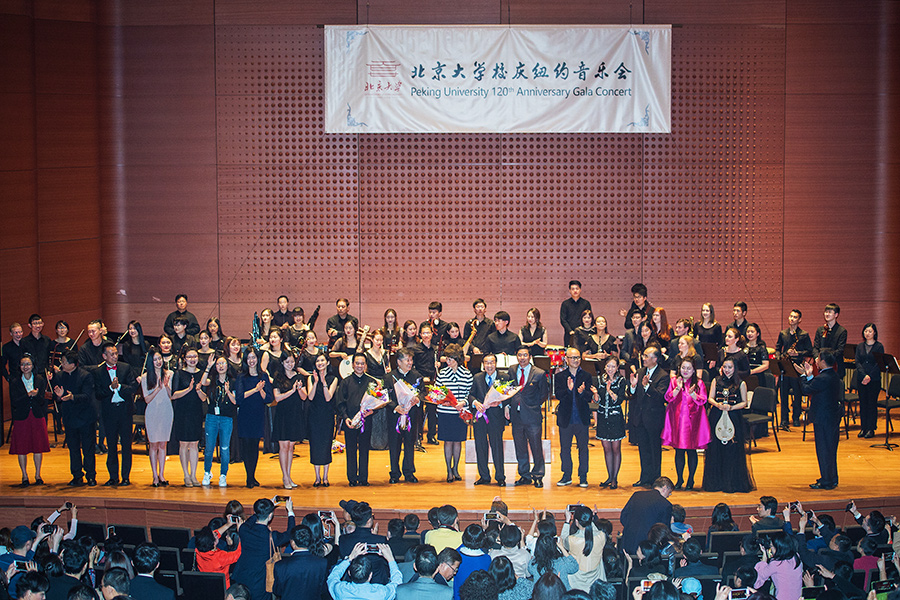美东时间5月13日晚,北京大学教育基金会(美国)和北京大学大纽约地区校友会在纽约林肯中心联合举办“Beyond Music:北京大学校庆纽约音乐会”。 1000余位旅居海外的北大校友和北大之友齐聚纽约,庆祝北京大学120周岁生日。北京大学学生民乐团不远万里来到纽约,与哥伦比亚大学学生艺术团以及著名旅美钢琴演奏家殷承宗联袂献上了一台尽显中国传统文化底蕴和时代韵律的民乐盛会。中国驻纽约总领事馆教育组徐永吉参赞和王文华等多位教育领事、北京大学的老朋友赵锡成博士和赵小兰女士、北京大学教育基金会秘书长李宇宁、北京大学大纽约地区校友会会长黄河等出席音乐会。音乐会由北京大学教育基金会(美国)总裁赵琳主持。