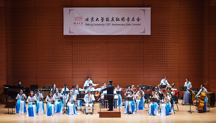 作为中国音乐高等教育的发源地,北京大学学生民乐团的历史可以追溯至蔡元培任北大校长时成立的“北京大学音乐团”;1922年改组为“北京大学附设音乐传习所”,提出“以养成乐学人才为宗旨,一面传习西洋音乐,一面保存中国古乐,发扬而光大之”。在百廿北大特有的历史文化氛围中,民乐团以一种别样的方式为北大“守正创新、引领未来”的校庆主题注入了新的阐释与活力。在这次校庆音乐会中,民乐团不仅为听众们演奏了《渔舟唱晚》、《梁祝》等经典民乐曲目,还与著名钢琴演奏家殷承宗先生以及哥大学生艺术团合作,演奏专门为此次音乐会重新改编和配器,融合传统与现代、东方与西方音乐元素的《后土》、《黄河》、《光明行》和《良宵》等作品。音乐会在中美青年共奏《北京喜讯》的热烈气氛中落下帷幕。本次音乐会由中央音乐学院王甫建教授担任指挥,北京大学禹洁任艺术总监,北京大学大纽约地区校友会余歌任总导演。
