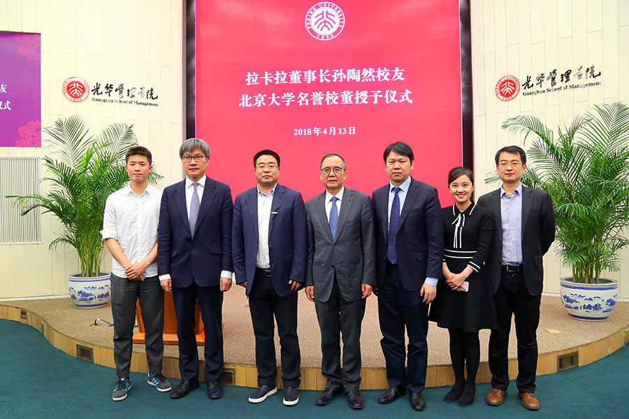 拉卡拉董事长孙陶然校友、公共事务副总裁姚凯、公共事务高级经理朱婕,与北京大学校长林建华,光华管理学院院长刘俏,教育基金会副秘书长耿姝,光华管理学院党委副书记滕飞,团委副书记、学生团体部部长石长翼,校友企业家俱乐部执行秘书长白帆等共同出席。副校长、教育基金会副理事长王博主持仪式。