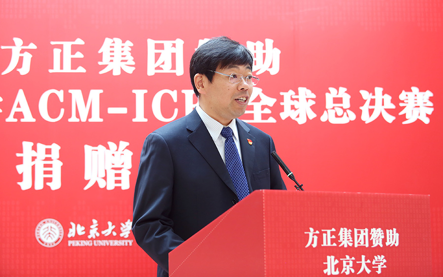 王仰麟副校长在致辞中表示,北大在120周年校庆之际举办ACM-ICPC全球总决赛,希望以此推动计算机教育在中国的普及,激发更多学生学习计算机的热情,为国家人工智能战略培养和输送更优质的后辈人才。王仰麟副校长感谢方正集团一直以来对北大教育事业发展的持续支持,他很欣喜能够看到与北大有深厚渊源的方正集团作为中国企业首次成为该项赛事的全球钻石赞助商。王仰麟副校长希望双方共同努力办好本次大赛,为计算机学科人才培养做出新的贡献。
