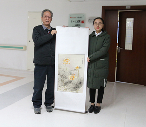 外国语学院胡沐向杨辛先生赠送自己的工笔画《香莲》