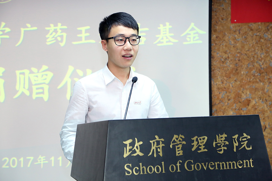 北京大学学生会主席、工学院2014级本科生孙北奇作为学生代表感谢广药集团对青年一辈的关怀和对国家教育事业发展的高度支持。他相信基金的设立将助力北大学子成长成才,开拓学生的国际视野,推进校园活动的顺利开展,全面提高学生的综合素质,为国家发展培育高素质的人才。
