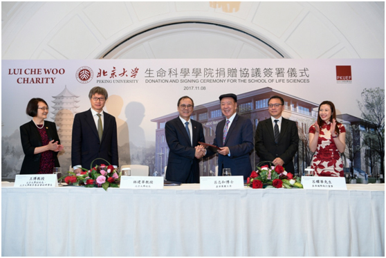 11月8日,林建华校长一行出席了“北京大学生命科学学院捐赠协议签署仪式”。嘉华集团主席及创办人吕志和博士宣布向北京大学捐资1.2亿元,设立“吕志和生命科学学院基金”,主要用于建设北京大学生命科学科研大楼,支持生命科学学院的发展。为纪念吕志和博士的巨大贡献,为吕志和博士颁授“北京大学杰出教育贡献奖”,将在2018年初全面落成并投入使用的北京大学生命科学科研大楼也被命名为“吕志和楼”。林建华校长,副校长、教育基金会副理事长王博,分别代表北京大学、北京大学教育基金会与吕志和博士共同签署捐赠协议。生命科学学院院长吴虹教授,教育基金会秘书长、校友会秘书长李宇宁,校长办公室副主任李航,港澳台办公室副主任王勇,教育基金会副秘书长耿姝等共同出席仪式。