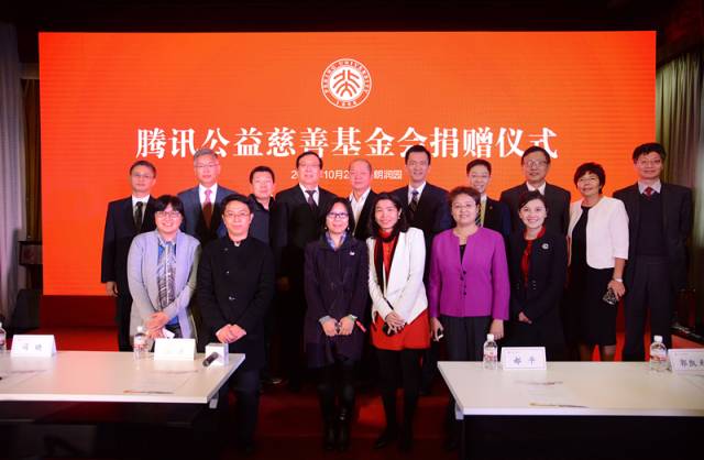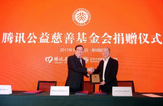 10月28日,腾讯公益慈善基金会北京大学捐赠仪式在北京大学国家发展研究院朗润园举行。北京大学党委书记郝平、北京大学国家发展研究院院长姚洋、腾讯公司高级副总裁郭凯天、腾讯研究院院长司晓等共同出席了此次捐赠活动。