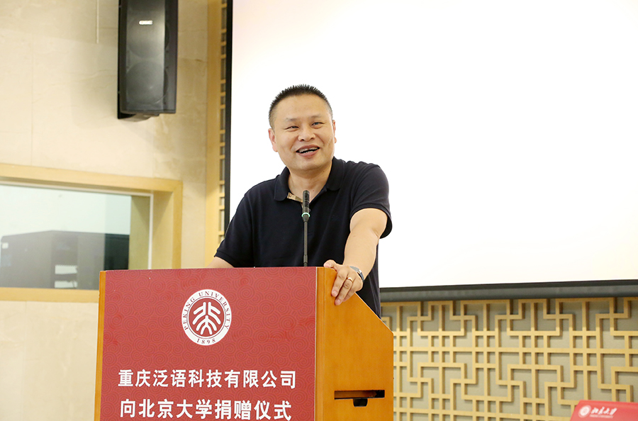 9月1日,重庆泛语科技有限公司向北京大学捐赠仪式在北京大学教育基金会北大之友报告厅举行。重庆泛语科技有限公司总经理谭涛先生、副总经理于慧芳女士出席仪式。北京大学副校长王博教授,教育基金会秘书长邓娅博士,信息管理系党委书记张久珍教授、副系主任王继民教授,及北大师生代表等出席,捐赠仪式由北大教育基金会副秘书长耿姝主持。