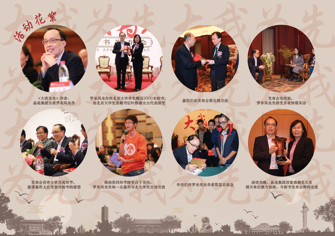罗乐风先生发表精彩演讲。他表示,《大我为先》不是个人自传,而是以感恩的心出发,讲述晶苑人秉持“大我为先、以人为本”的企业文化,努力向前,以不屈不挠的精神,将夕阳行业变骄阳的故事。罗先生表示,自己凭借“大我为先、以人为本”理念,建立企业核心价值观,感染全体员工,让晶苑人做到“我为人人,人人为我”,让每一个人以无私的精神为企业、为世界而努力,拥有“改变自己,改变企业,改变世界”的使命感。同时“大我为先、以人为本”的理念更能帮助人们解决生活中的种种问题。他说,出版这本书是为与大家分享自己的经营管理之道,面对愈来愈强的全球化竞争压力,通过本书可以鞭策自己,更鼓励晶苑员工继续向前,也为学子们提供一个思考的平台,希望各位同学在未来光明的前途上,努力建立互助互爱的共融世界。。他呼吁广大同胞和企业认同“大我为先”的理念,以一个负责人的心态先由改变自己开始,一起为中国的未来而努力。