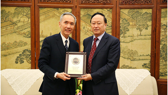 在会面中,朱书记向黄志祥先生颁授北京大学名誉校董铜牌,并颁发北京大学国际咨询委员会委员聘书。学生代表为黄志祥校董佩戴北京大学校徽并献花。