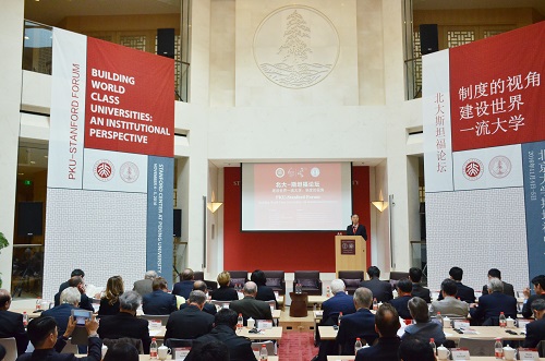 2016年11月4日,第二届北大-斯坦福论坛暨2016年北京论坛教育分论坛在北京大学斯坦福中心拉开帷幕。本届北大-斯坦福论坛的主题为“建设世界一流大学:制度的视角”。在为期两天的会议中,来自中国、美国、加拿大、澳大利亚、英国、俄罗斯、芬兰、日本、韩国、菲律宾、巴基斯坦,以及中国香港和澳门等国家和地区的40余位大学校长和学者、国际组织专家汇聚一堂,共同探讨世界一流大学的产生、组织、管理和发展等重要问题。