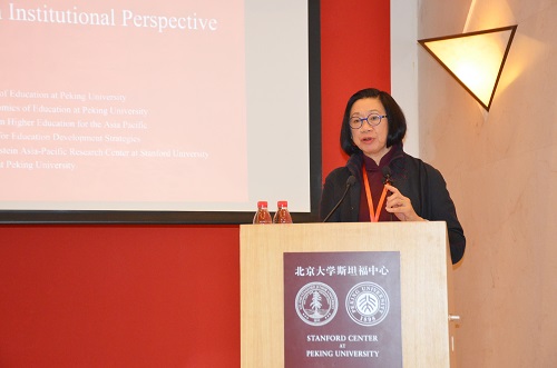 戴慕珍在致辞中对各位专家学者的到来表示热烈的欢迎。她指出,在过去5年中,北京大学斯坦福中心不仅为斯坦福大学师生了解和研究中国提供了重要的支持,同时也为中美两国乃至全球优秀学者提供了学术交流平台;建设世界一流大学已成为各国增强国家竞争力、发展高等教育的重要战略,论坛为更加深入地探讨这一问题提供了契机。戴慕珍感谢北京大学、北京大学教育学院对本届论坛的支持,并预祝论坛圆满成功。