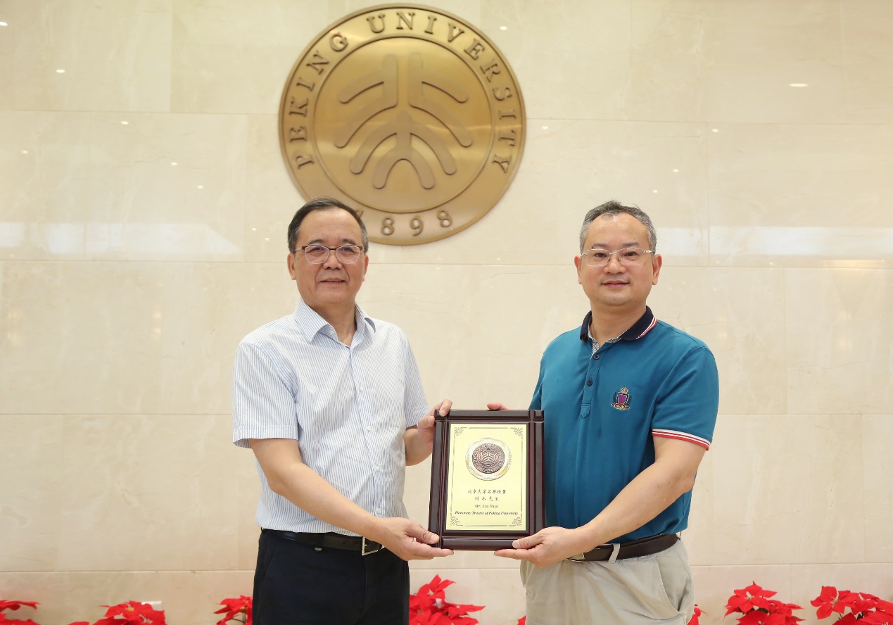 林建华校长代表学校向刘水校友颁授北京大学名誉校董铜牌