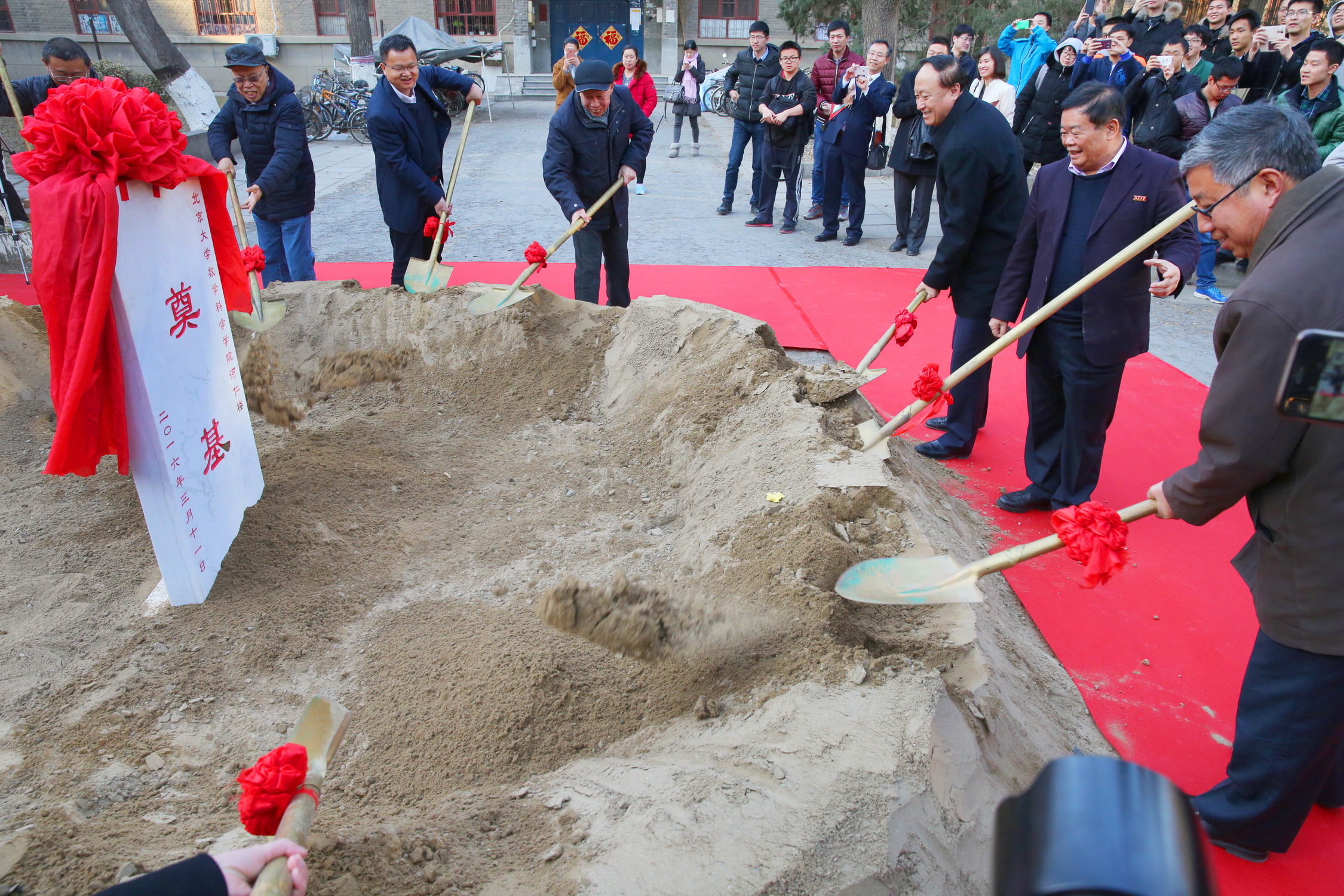 演讲会结束后,在场嘉宾和师生代表来到五四大道,共同为数学科学学院大楼奠基。(记者:张欣)