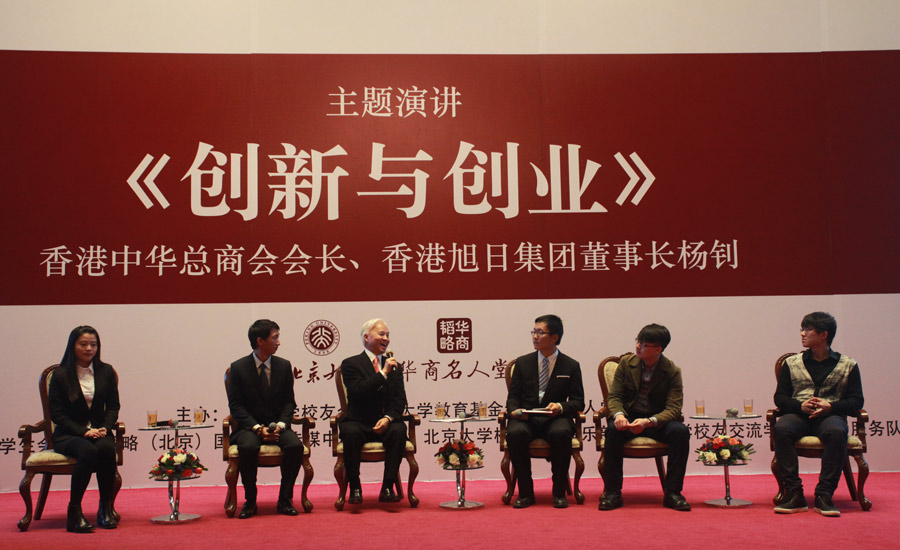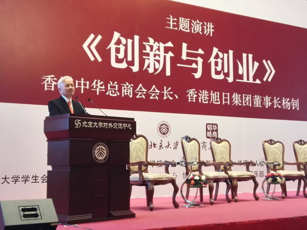 11月15日,香港中华总商会会长、旭日集团董事长杨钊在北京大学“PKU Speech|华商名人堂”发表“创新与创业”主题演讲。作为香港著名企业家、慈善家,杨钊先生分享了自己40多年商旅历程中最核心的经验与体会,并与青年代表及北大学子进行现场交流,带来了一堂接地气、非常实用的创业课。