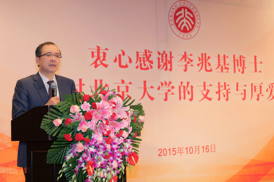 林建华校长在致辞中表示,北京大学要守正创新,建设世界一流大学,必须要坚守北大深厚的人文底蕴和传统,弘扬人文精神,成为产生新思想和理论前沿的学术殿堂。数年来,各方的宝贵支持,通过数以万计北大学子的成才和担当、通过北大师生校友创造性的艰苦努力,已经转化为传承中华文明、振兴国家民族、沟通国际社会、增进人类福祉的无穷力量。李兆基先生的慷慨捐赠为北大人文学科发展和中华文化传承做出了彪炳史册的贡献。他向李兆基先生和各位来宾表示最衷心的感谢和崇高的敬意,期待和欢迎更多的远见卓识之士参与到中国高等教育发展的伟大事业之中。