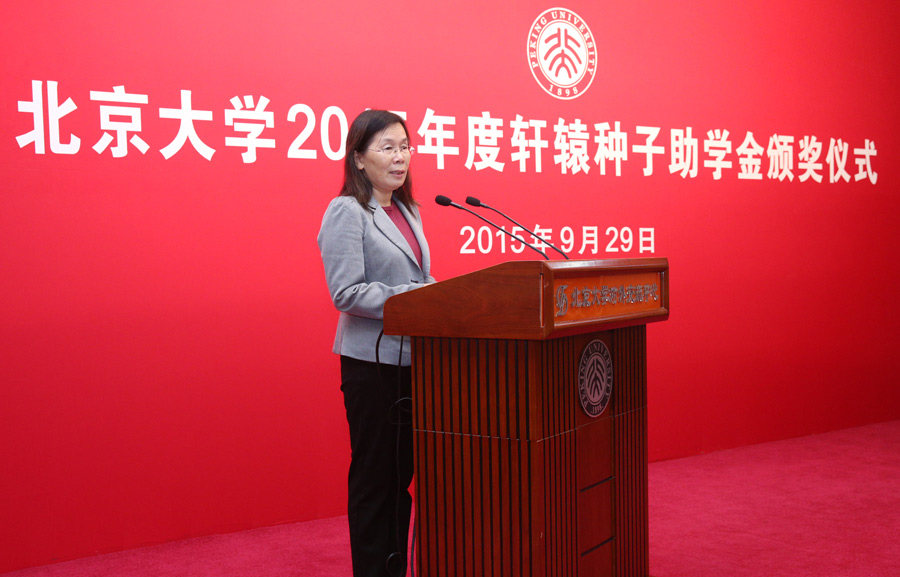 北京大学党委副书记叶静漪代表学校致辞。她感谢轩辕基金会和港九药房总商会的善长们通过一系列的活动,传播大爱理念,帮助北大学子更好地完成学业。仪式最后,各位嘉宾和叶静漪副书记共同为获助学生颁发2015年度轩辕种子助学金。叶静漪副书记向轩辕教育基金会和港九药房总商会授予北京大学教育贡献奖,感谢和表彰他们为北京大学人才培养事业做出的贡献。