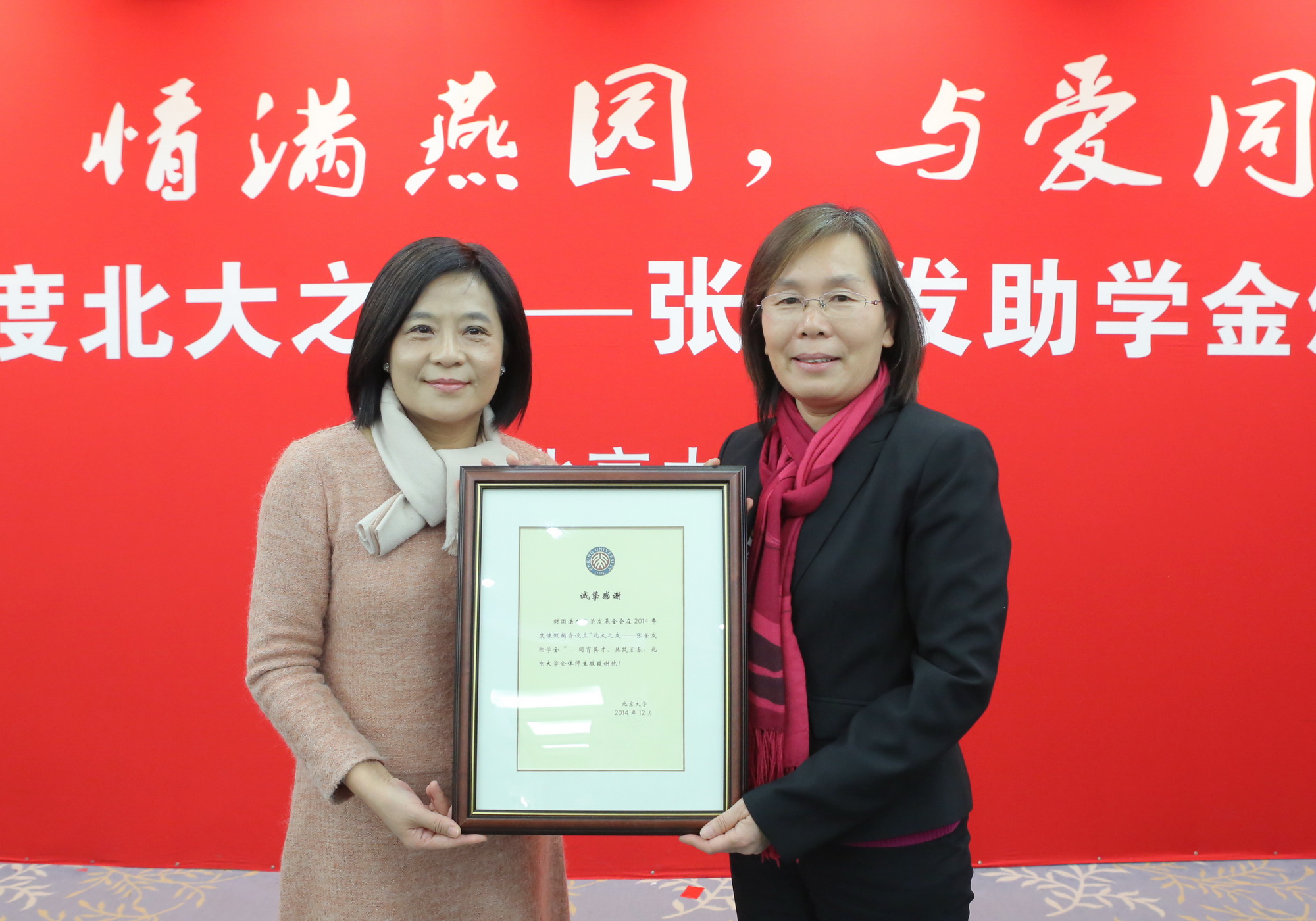 为了表达师生们对财团法人张荣发基金会的真诚感谢,叶静漪副书记代表北京大学向钟德美总执行长颁赠感谢状。钟德美总执行长也代表长荣集团和张荣发先生向北京大学赠送了长荣集团“模型船”和基金会的出版物。