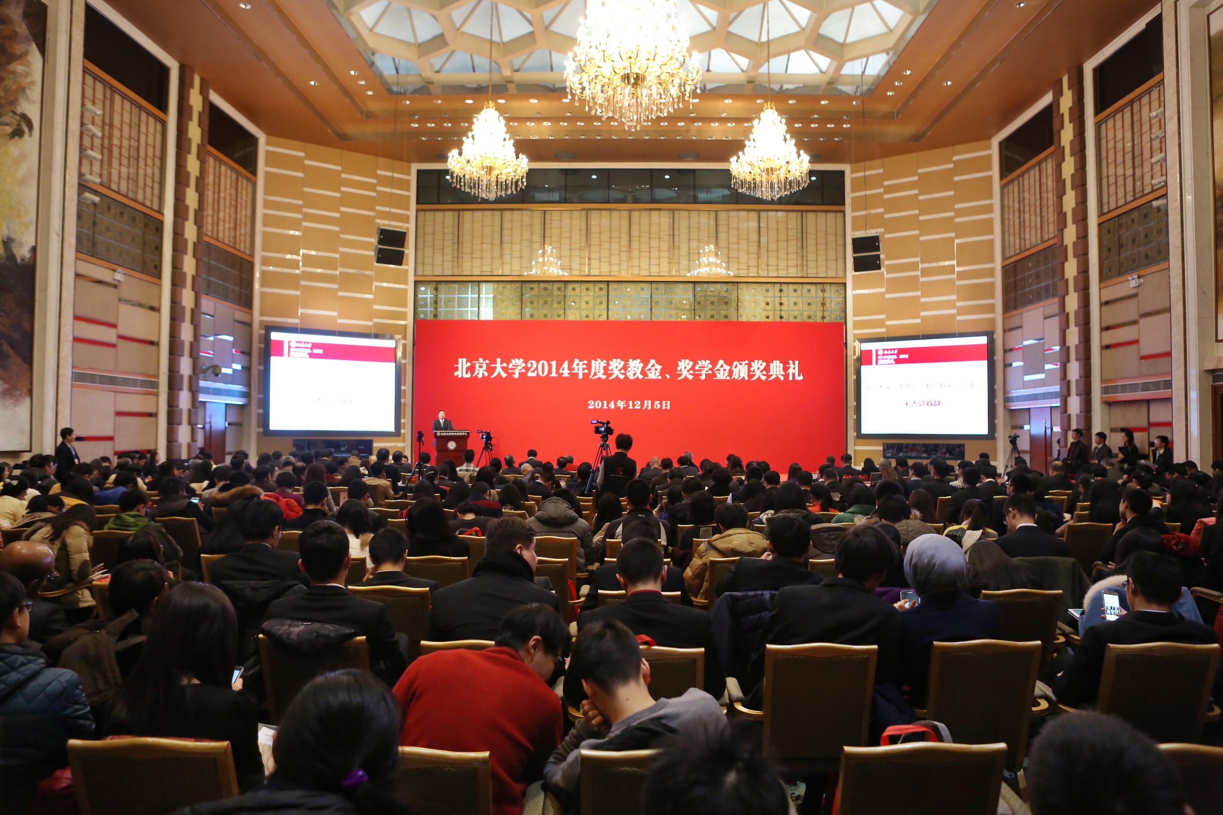 12月5日下午,北京大学2014年度奖教金、奖学金颁奖典礼在英杰交流中心阳光厅举行。碧桂园集团董事局主席杨国强、中国工商银行总行副行长郑万春、北京市教育工作委员会副主任郑登文、方正集团董事长魏新、信和集团中国业务总经理黄若红、正大集团资深副董事长谢毅等单位代表专程莅临北京大学出席颁奖典礼。北京大学党委书记朱善璐、常务副校长刘伟、副校长王杰、党委副书记叶静漪、副校长李岩松、校长助理李晓明、程旭、马化祥、孙丽及获奖教师、学生代表参加了颁奖典礼。此次颁奖典礼还特别邀请了两位德高望重的先生,北京大学经济学院94岁高龄的张友仁教授和北京大学哲学系93岁高龄的杨辛先生。典礼由校长助理、教育基金会秘书长邓娅主持。