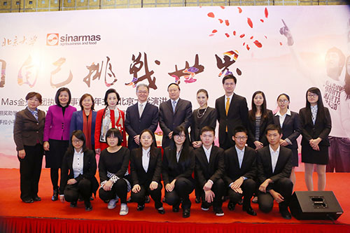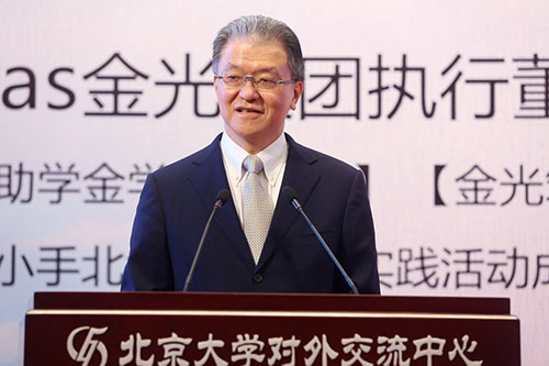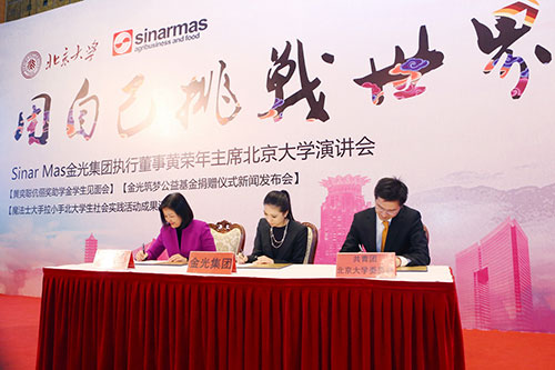 11月6日,印尼金光集团执行董事黄荣年先生携家人一行访问北京大学,出席北京大学2014年黄奕聪伉俪奖助学金颁奖典礼暨“金光筑梦”基金签约仪式并发表演讲。北京大学党委书记朱善璐、副书记叶静漪、校长助理、教育基金会秘书长邓娅等学校领导和师生代表共同参加典礼。