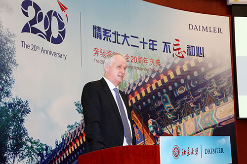 唐仕凯先生在致辞中介绍戴姆勒公司作为全球汽车工业的先行者和开创者,长期以来致力于促进全球可持续发展和发现、造就优秀人才为两大战略重点。他认为,戴姆勒与北大过去20年的合作,已经培养了各行各业的领军人物;未来20年,戴姆勒将与北大展开更多更深入的合作,也欢迎北大的优秀学子加入戴姆勒公司。