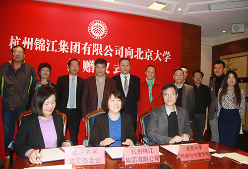11月19日上午,杭州锦江集团有限公司在北京大学签署捐赠协议,宣布将参与设立北京大学战略传播研究基金,支持北大建设国际一流的传播研究智库。北京大学党委书记、教育基金会理事长朱善璐在捐赠仪式开始之前会见了各位来宾。刘伟常务副校长出席仪式并讲话。杭州锦江集团有限公司总经理王元珞女士、北京大学校长助理、教育基金会秘书长邓娅、新闻与传播学院院长陆绍阳教授共同签署了捐赠协议。新闻与传播学院程曼丽教授主持仪式。
