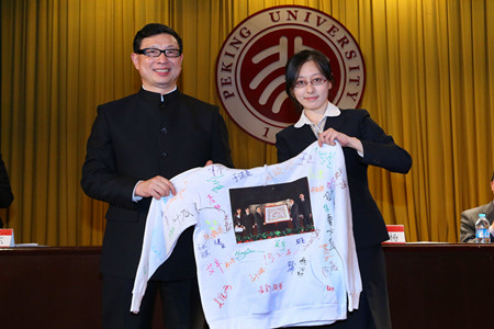 获奖学生代表、光华管理学院2010级本科生李露霖代表全体获奖同学表达了对光华教育基金会的崇高敬意以及对老师辛勤培育的感激之情,并表示全体获奖同学一定会在畅游知识海洋、承担社会责任、投身社会实践的基础上继续奋斗,志存高远,不辜负基金会和学校的殷切期望。发言最后,学生代表向贾宁博士赠送了有获奖同学集体签名的北大帽衫。