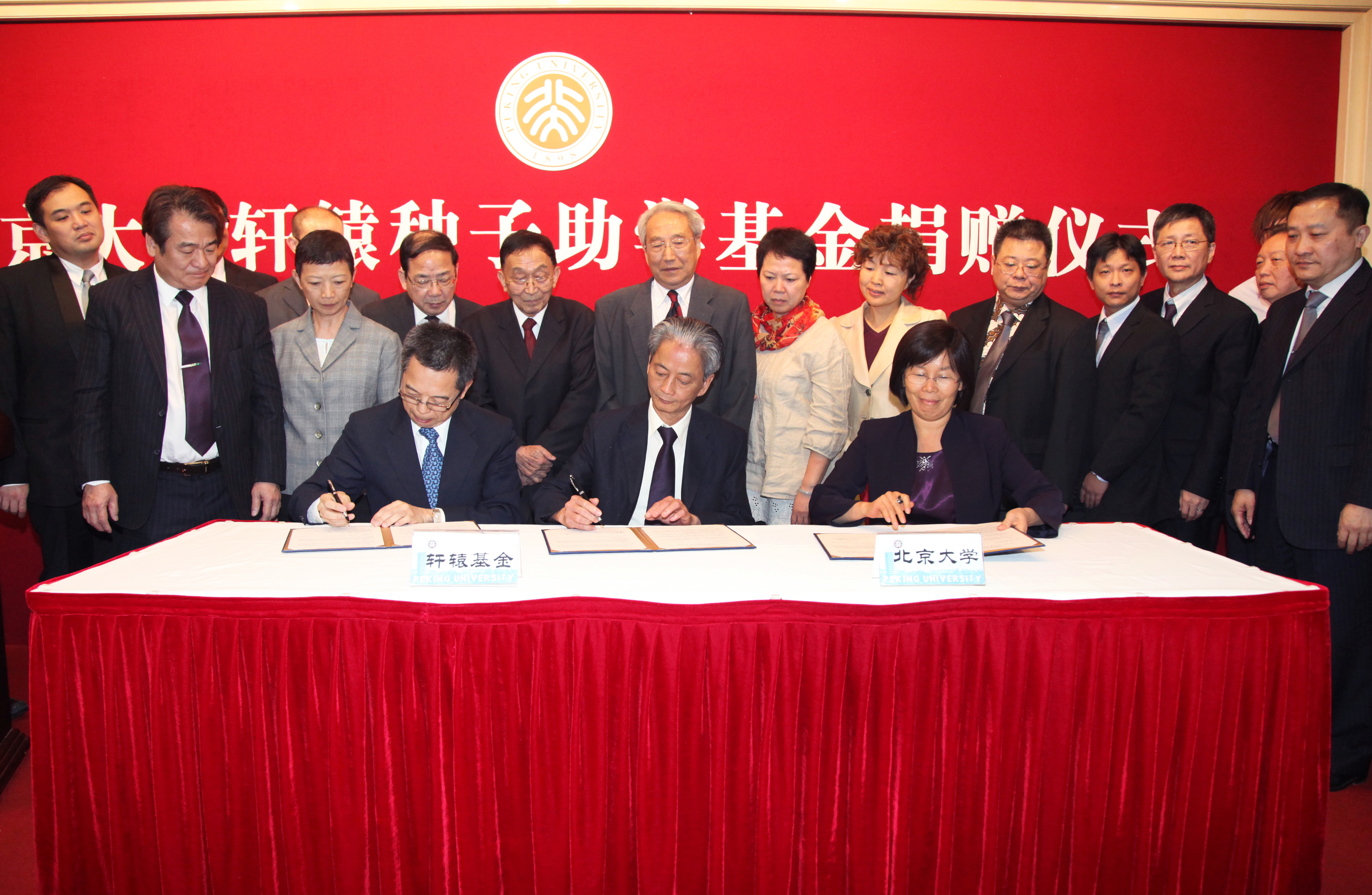 随后,轩辕教育基金会永远荣誉会长钟春荣先生、徐国才先生和叶静漪书记共同签署了北京大学轩辕种子助学基金协议。从2013年起,香港轩辕教育基金会每年将资助我校100名来自低收入家庭的优秀学子顺利完成学业,促进北大人才培养事业。