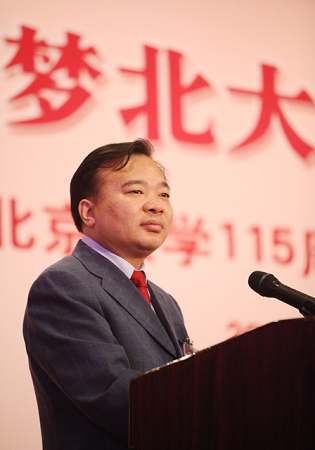 随后,朱善璐发表了《圆梦北大,筑梦中华》的主题演讲。他从北京大学的历史渊源娓娓道来,并通过新文化运动、五四运动、中国共产党的创建等发源于北京大学的、深刻影响中国近现代进程乃至世界历史的重大事件,强调北京大学不仅承担着中国高等教育的使命,也与国家的命运紧密相连,这在全世界高等学府中都是极为罕见的。朱书记还介绍道,在北京大学二十周年纪念会上,蔡元培校长表达了与当时的世界一流大学柏林大学、莱比锡大学等“平行之发展”的强烈愿望,可惜当时国家“百事停滞不前”,未能实现这个愿望。朱善璐提出,在95年后的今天,北京大学应当拿出令人满意的答卷,以回应蔡先生等北大先人的宏愿。他向全场嘉宾详细解读了北京大学“2048远景规划”和三步走的发展战略,表示北京大学力争在建校150周年、也就是中华人民共和国建国100周年前夕,建成中国特色、世界一流、北大气派与品格的最好的大学,能够代表国家和民族在世界上赢得尊严和骄傲。这不仅是全体北大人的心愿,更是党和国家对北大的历史要求,是全社会对北大的殷切期待。朱善璐引述习近平总书记给北大青年的回信内容时指出,在“中国梦”的感召下,北京大学必须接过先人的旗帜,在创建世界一流大学的征程上走好每一步。他对社会各界友人对北京大学的认识、理解、宽容、厚望,和给予北大精神、道义和物质上的支持表示诚挚的感谢,并表示,北京大学一定不会让社会各界失望,在同心共筑中国梦的征程中,北大愿与各位朋友并肩携手、齐心协力,为国家和民族做出新的历史性贡献。朱善璐的演讲感染了现场嘉宾,赢得了经久不息的掌声。