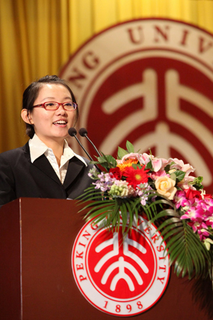 中国语言文学系2009级本科生刘葭子同学代表获奖学生感谢光华教育基金会在教育领域的善举和学校老师的辛勤培育,并表示将以奖励为动力,努力学习,志存高远,传承善举,服务社会。获奖学生代表向贾宁博士赠送了鲜花和北大四季图册,表达他们对光华教育基金会和贾宁博士的感谢与祝福。