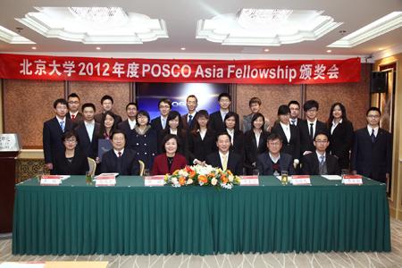 11月16日下午,北京大学2012年度POSCO Asia Fellowship 奖学金颁奖会在英杰交流中心第四会议室圆满举行。浦项(中国)投资有限公司副总经理甘圭植,浦项(中国)投资有限公司对外协力部部长池炫龙,POSCO青岩财团科长李东徽以及北京大学校长助理、教育基金会秘书长邓娅,学生工作部部长张庆东等出席会议。会议由北京大学教育基金会副秘书长李榕主持。