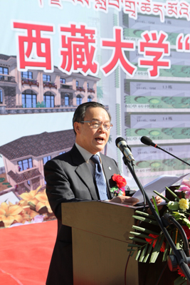 奠基典礼现场 西藏大学格桑群培校长首先致欢迎辞。他代表西藏大学向北京大学多年来对西藏大学各项事业的大力支援以及中坤集团给予藏大的慷慨惠助表示由衷的感谢和敬意。他指出,作为北京大学对口支援西藏大学的重点项目和中坤集团情系藏大的爱心工程,北大中坤专家楼的建设意义已经远远超出了项目本身,成为北大对口支援西藏大学的历史见证和北大、藏大与中坤集团三方团结友谊的重要象征。西藏大学将严格按照捐赠协议的要求,高质量、高速度、高效益的把北大中坤专家楼建设成为让各方满意的精品工程,为促进西藏大学基础设施和学科建设作出积极贡献。